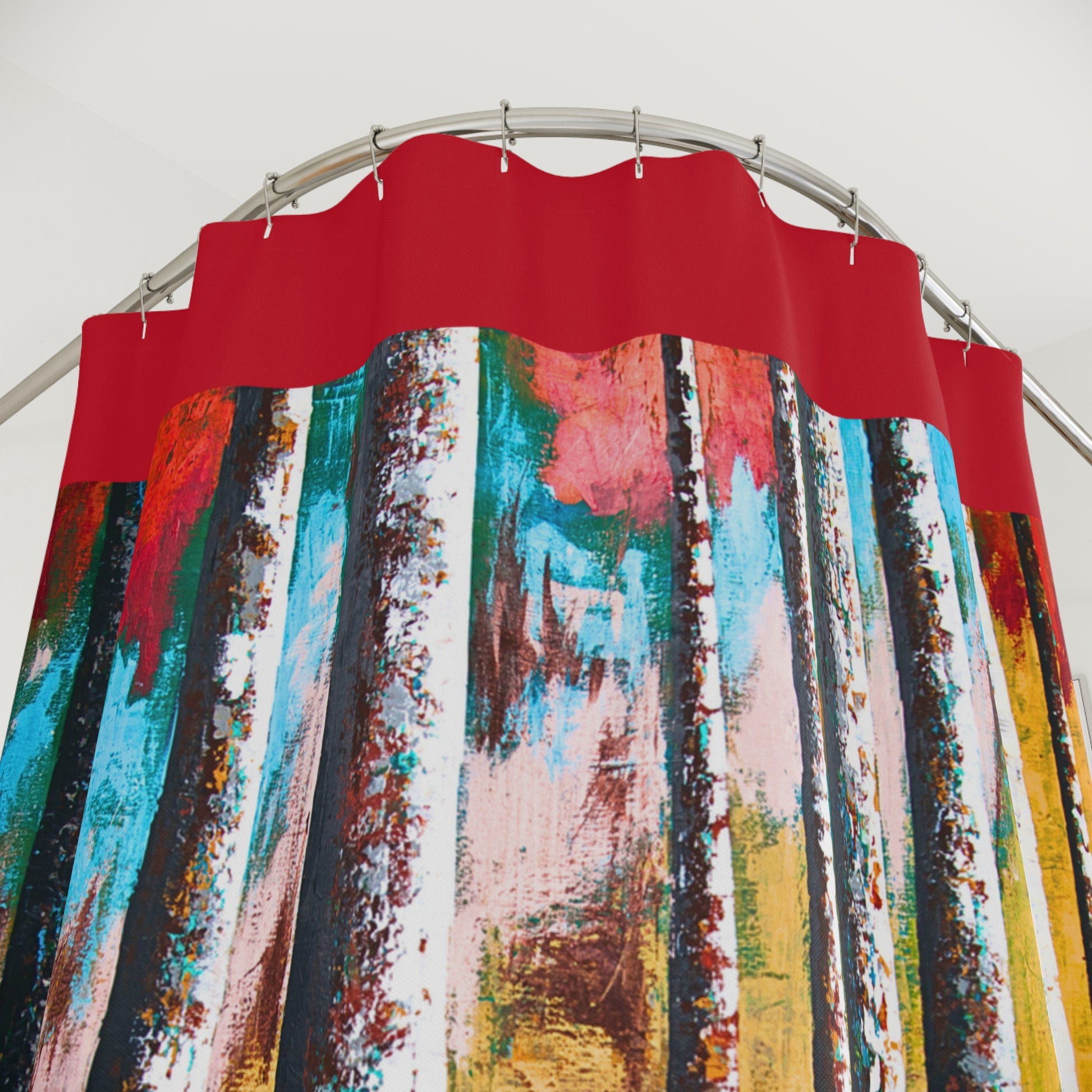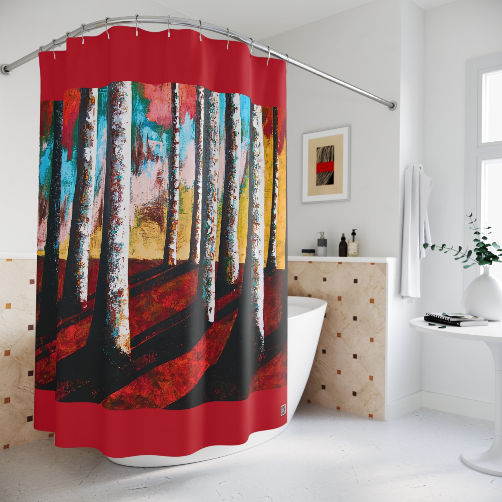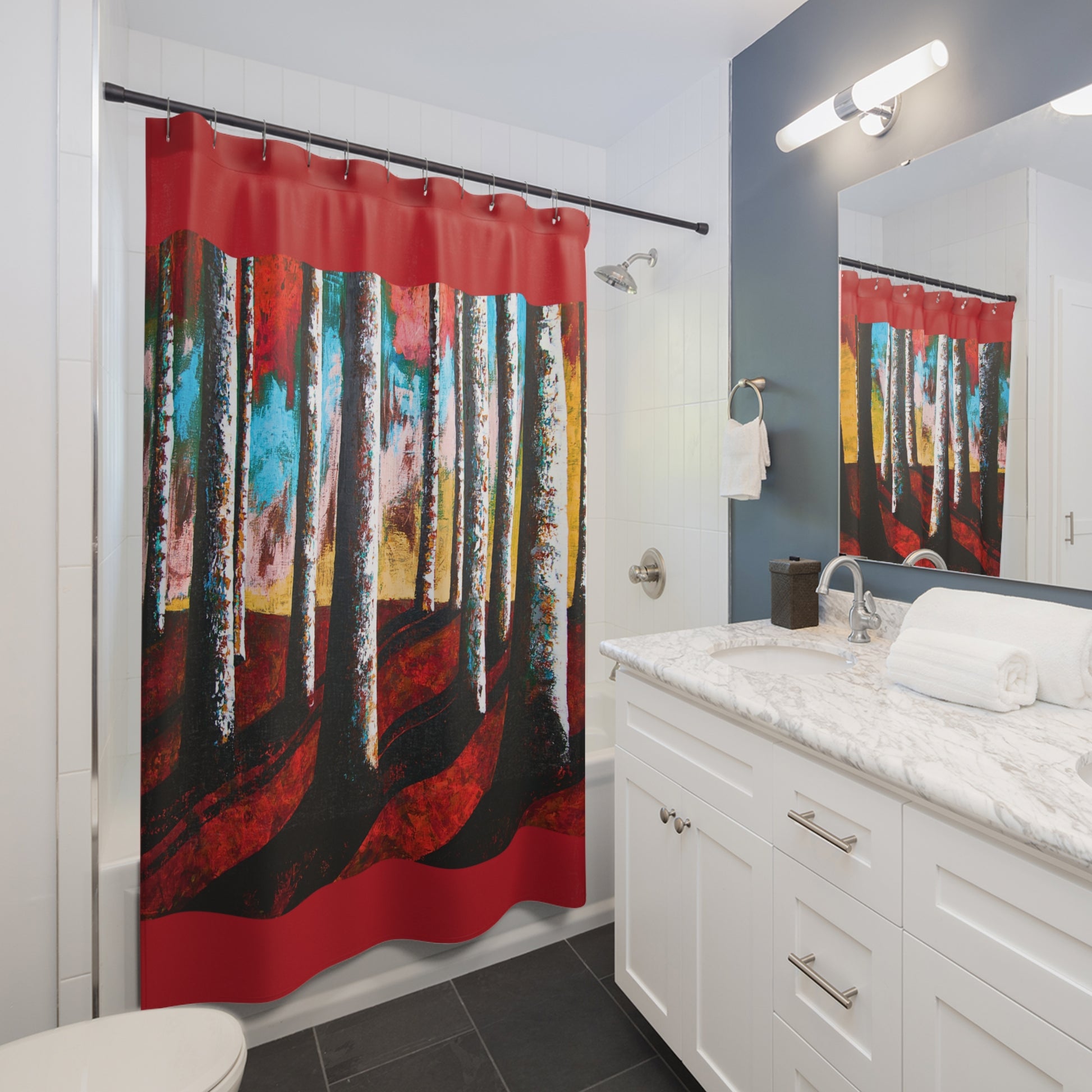 This shower curtain is designed to add a beautiful warm and bold touch to your bathroom, my hand painted original art has been carefully printed onto the front, leaving a gorgous boarder of deep red that enhances this classy bold statement  piece. Match with plain red towels and your bathroom will look as classy and stylish as any you've ever seen. This shower curtain adds an original touch with its hand painted fine art, not designed for the ordinary, your guests will be impressed and your mood lifted everytime you see it. Made with highly durable polyester, this curtain stays like new for a long time to come.