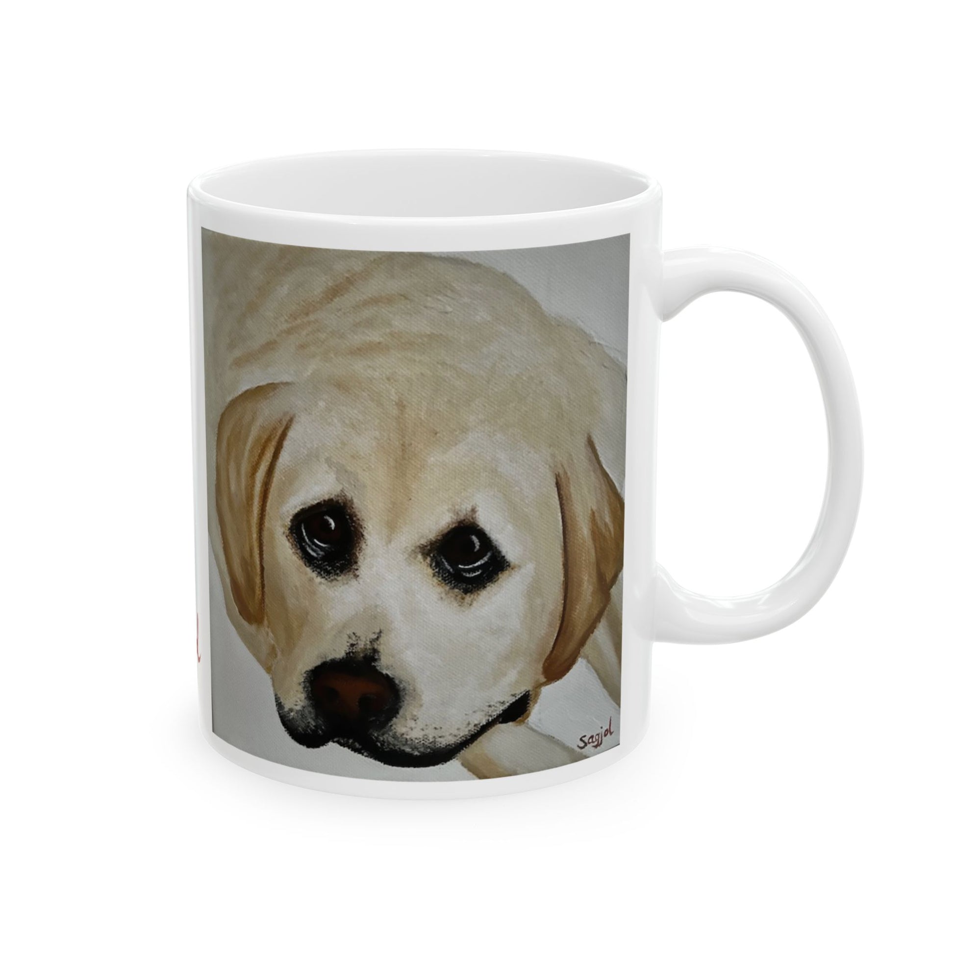 This ceramic mug features originalhand painted art by Sagjol titled "Cooper the Yellow Labrador" The soft colors in yellows and browns, bring life to this beautiful coffee mug, making it perfect for gifts, birthday gifts, Holiday Gifts and housewarming gifts. Be unique and buy original art from artists that don't mass produce. This mug is a great addition to your daily routine with its glossy finish and vibrant colors. It's microwave and dishwasher safe, making it convenient for everyday use. The durable white ceramic ensures that your prints stand out, and it's available in two sizes: 11oz and 15oz. Drink confidently on a daily basis as all mugs are lead and BPA-free.