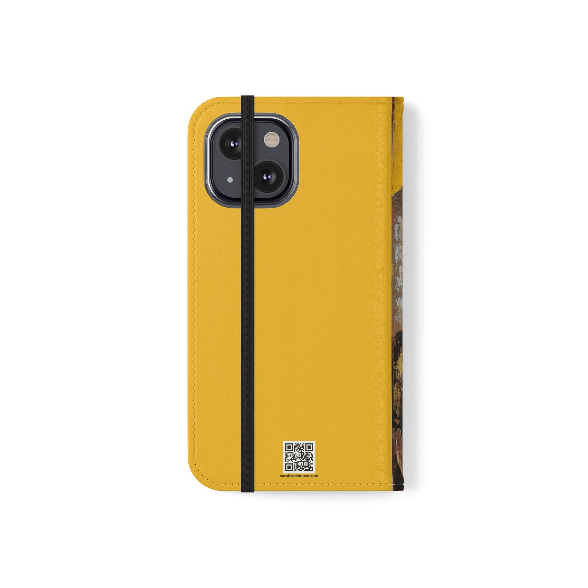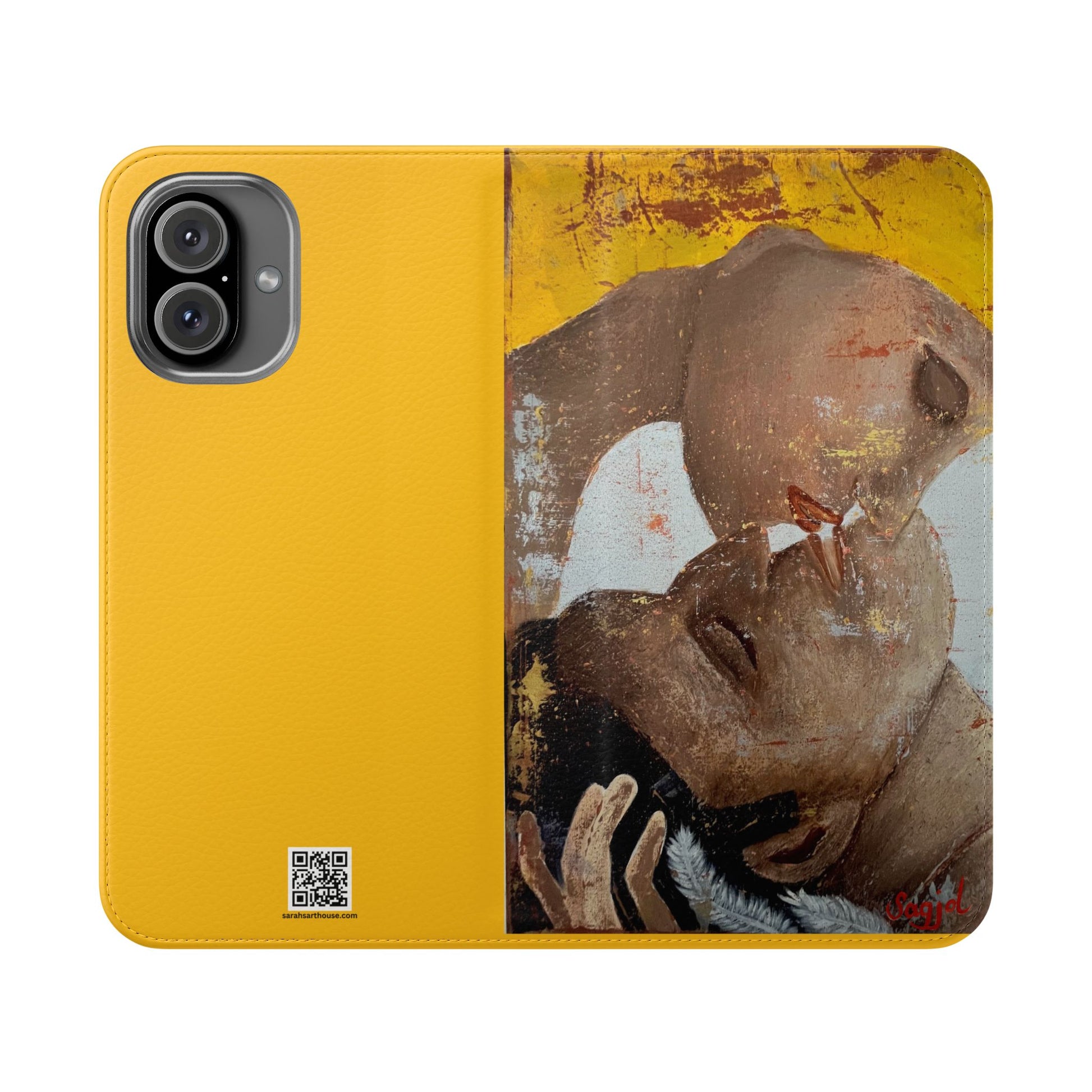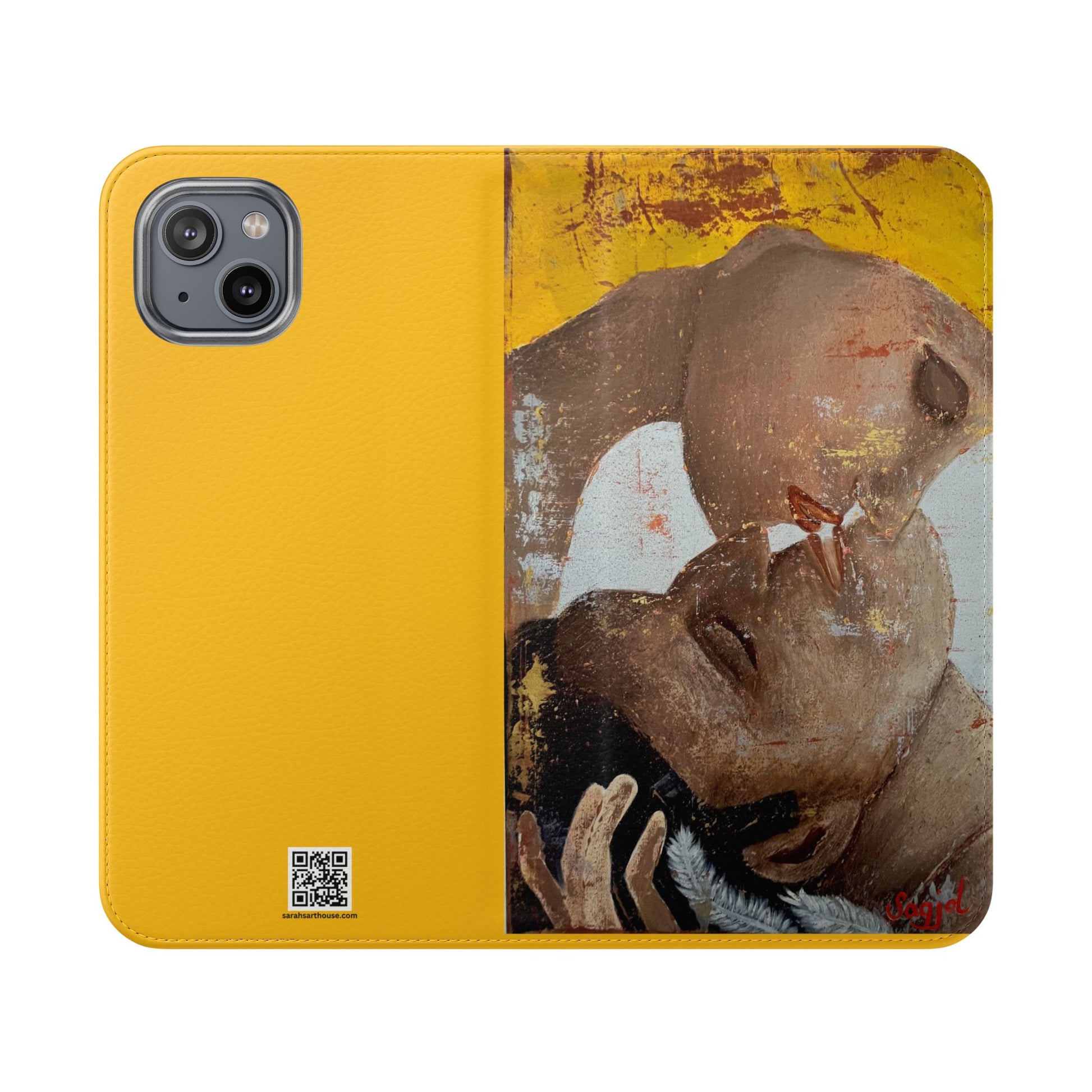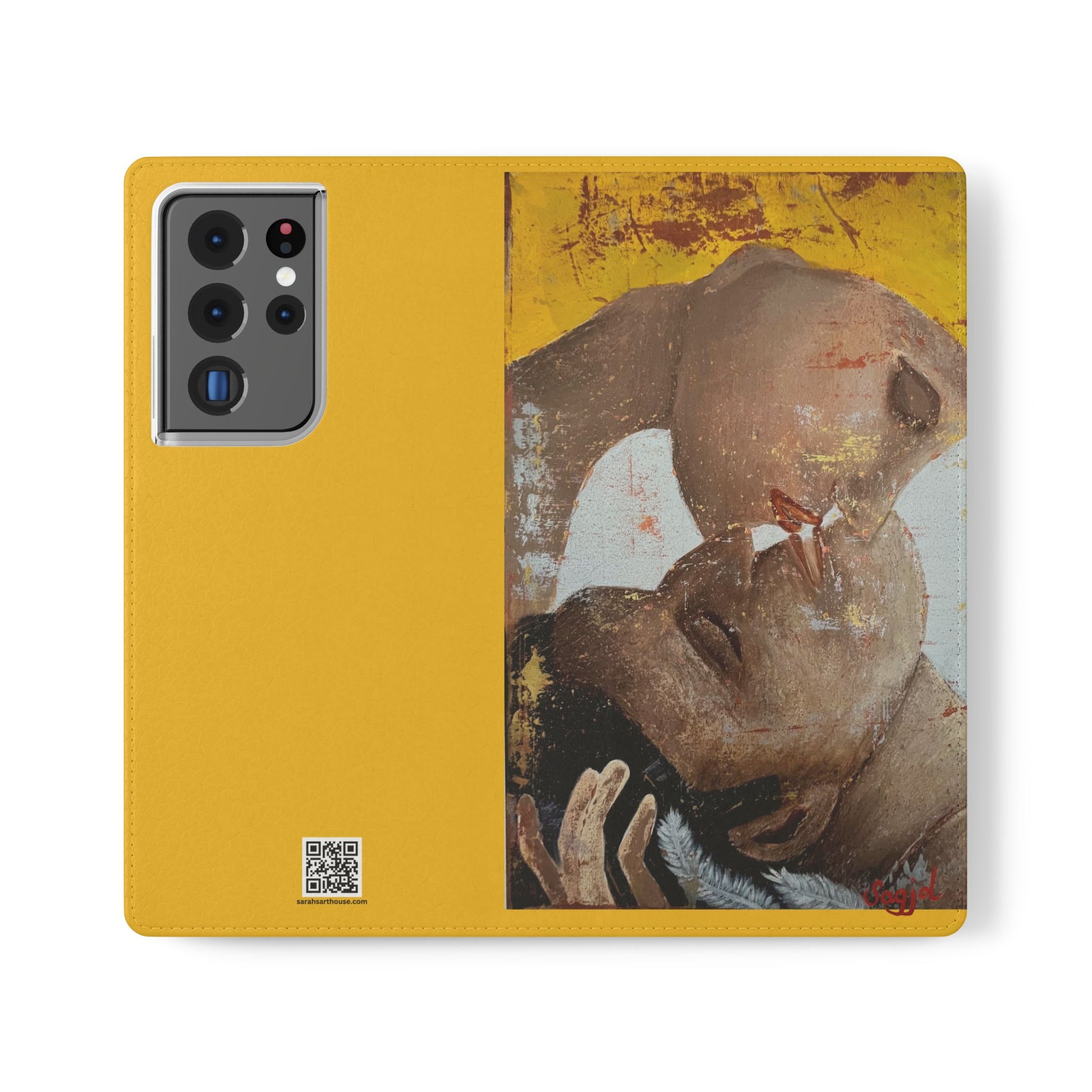 A vibrant and romantic phone case featuring hand painted original art by SAGJOL of two lovers kissing on a bright yellow background. This cruelty-free faux leather flip case includes convenient stitched pockets for cards and cash. Perfect gift for kids and adults looking to add originality to their phone accessories.