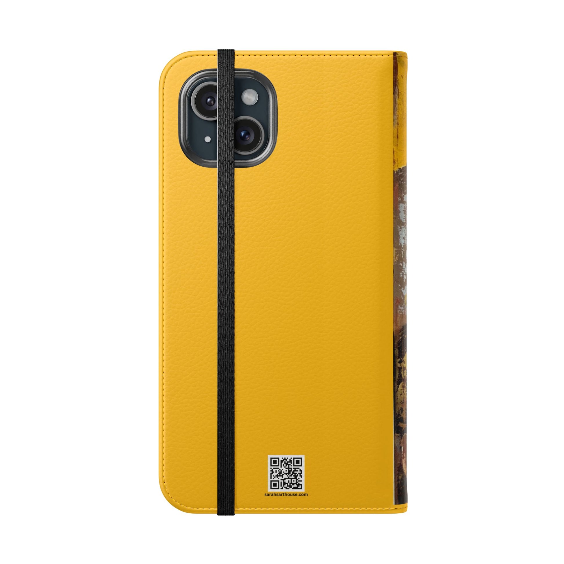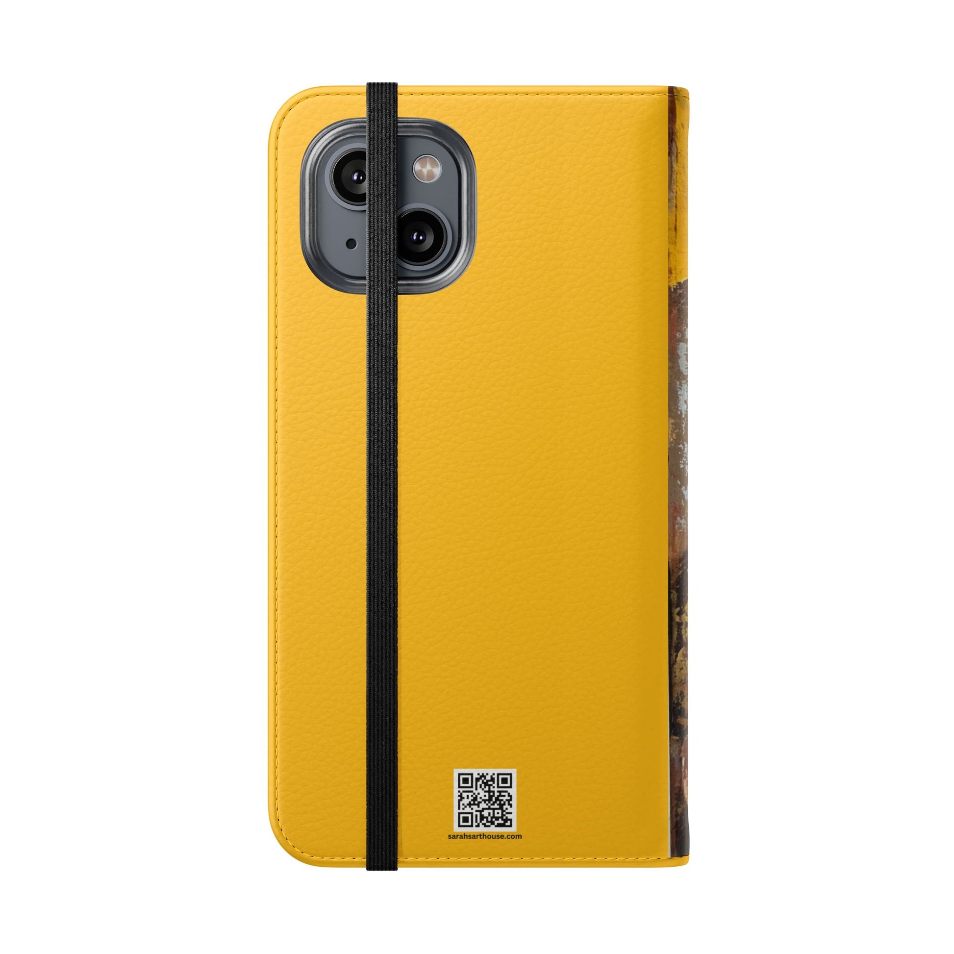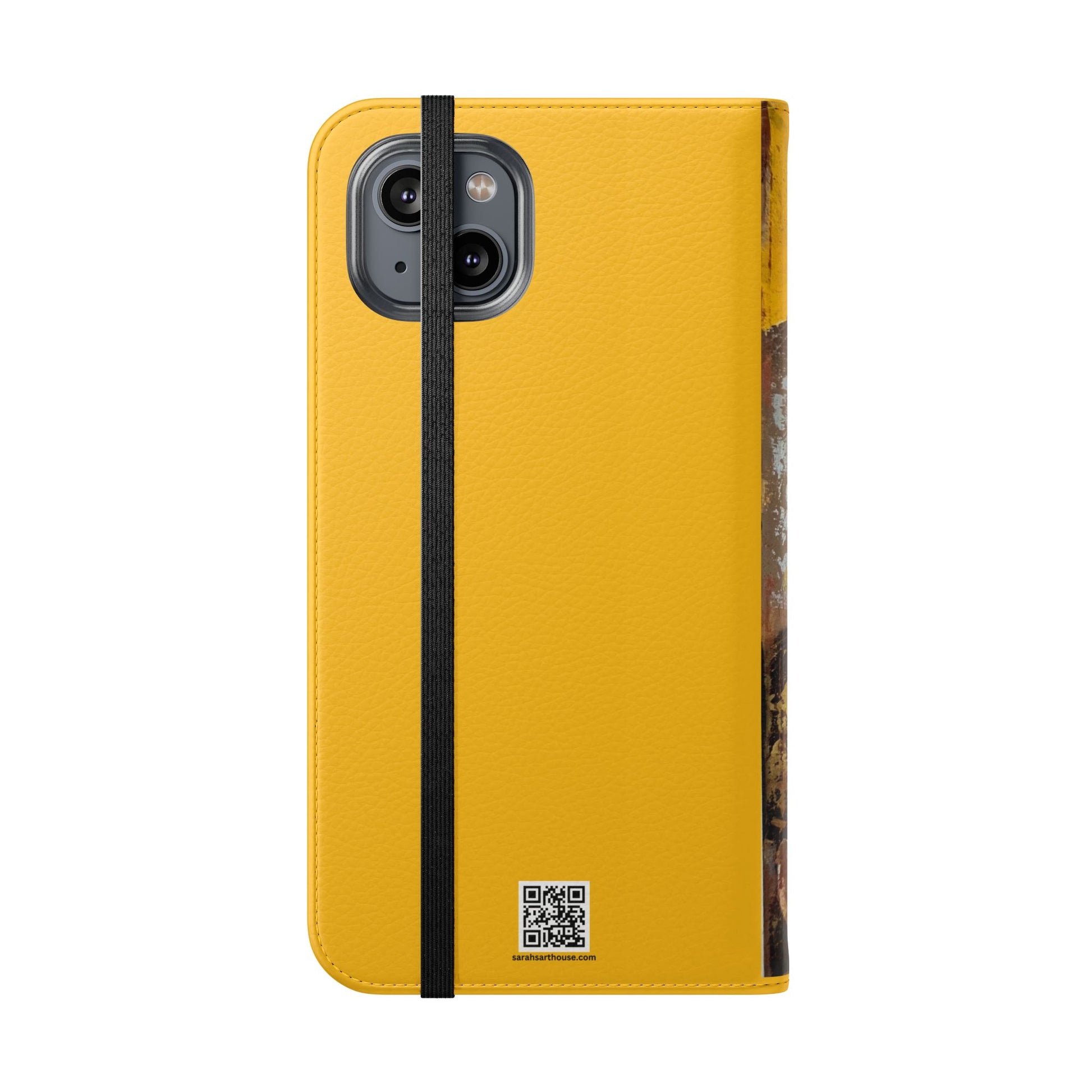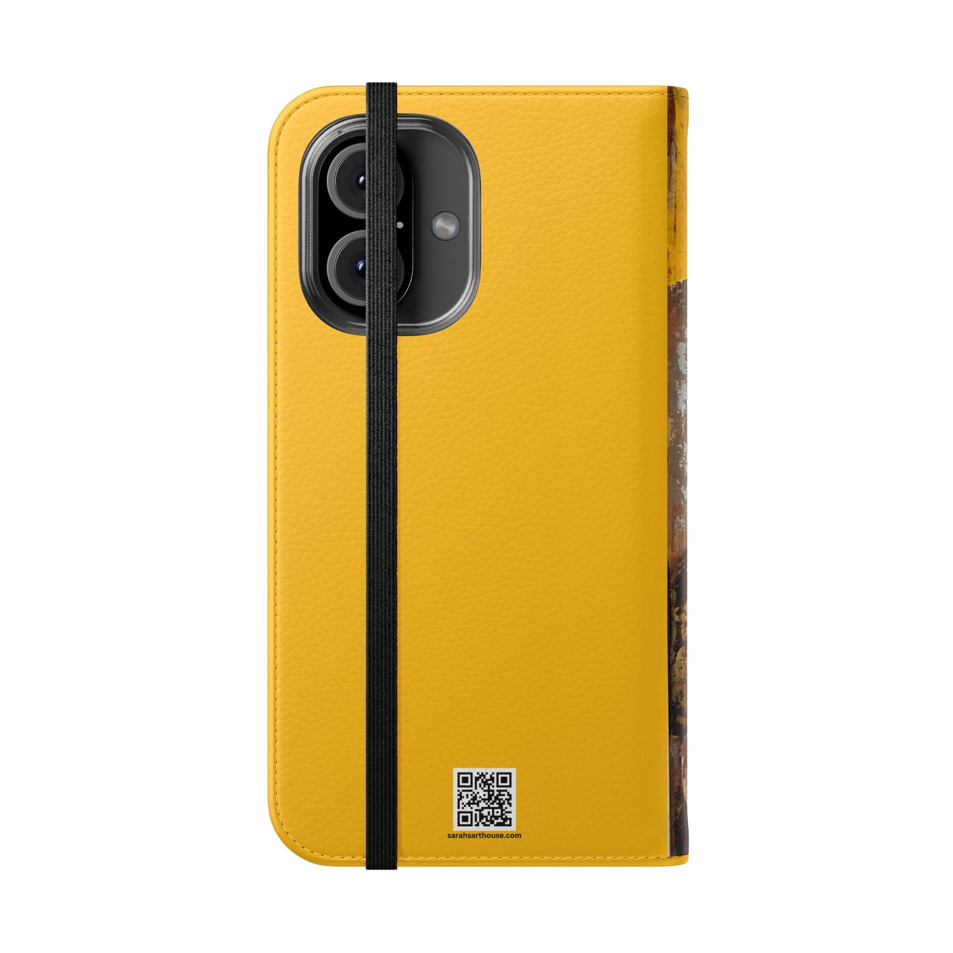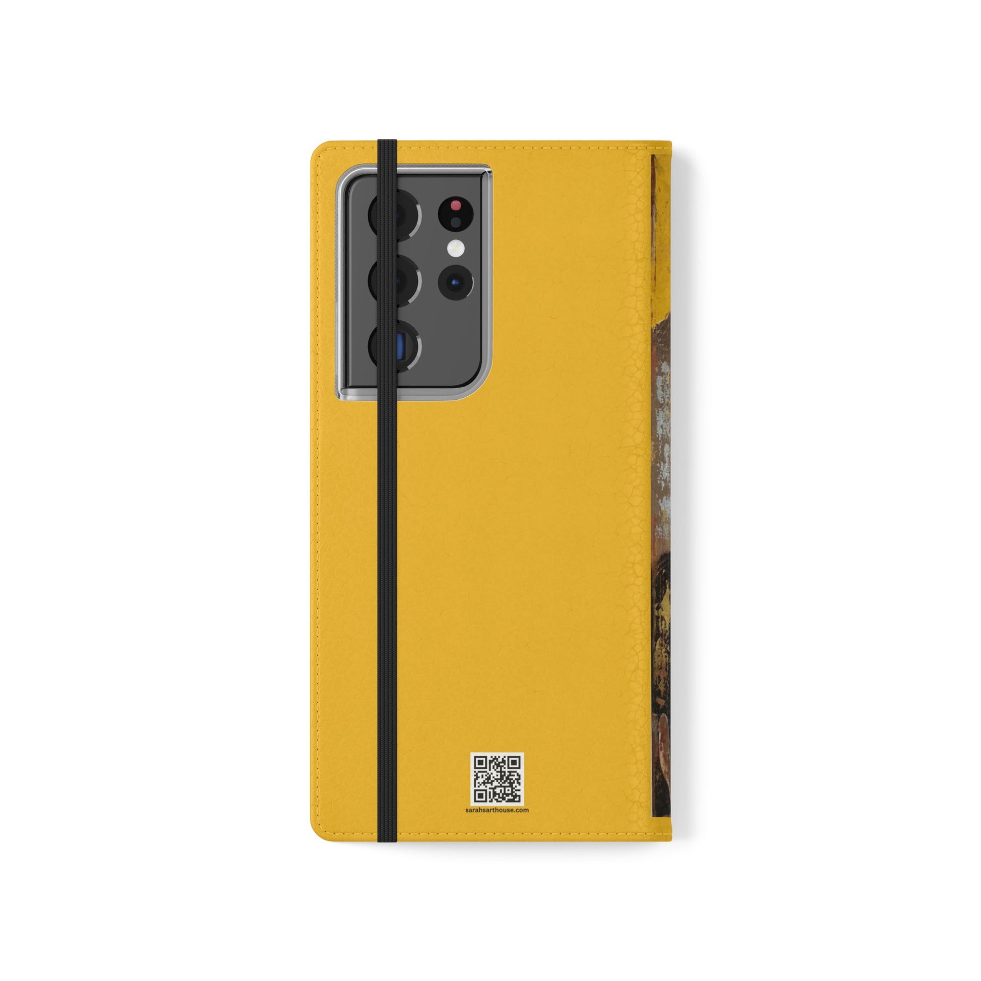 A vibrant and romantic phone case featuring hand painted original art by SAGJOL of two lovers kissing on a bright yellow background. This cruelty-free faux leather flip case includes convenient stitched pockets for cards and cash. Perfect gift for kids and adults looking to add originality to their phone accessories.