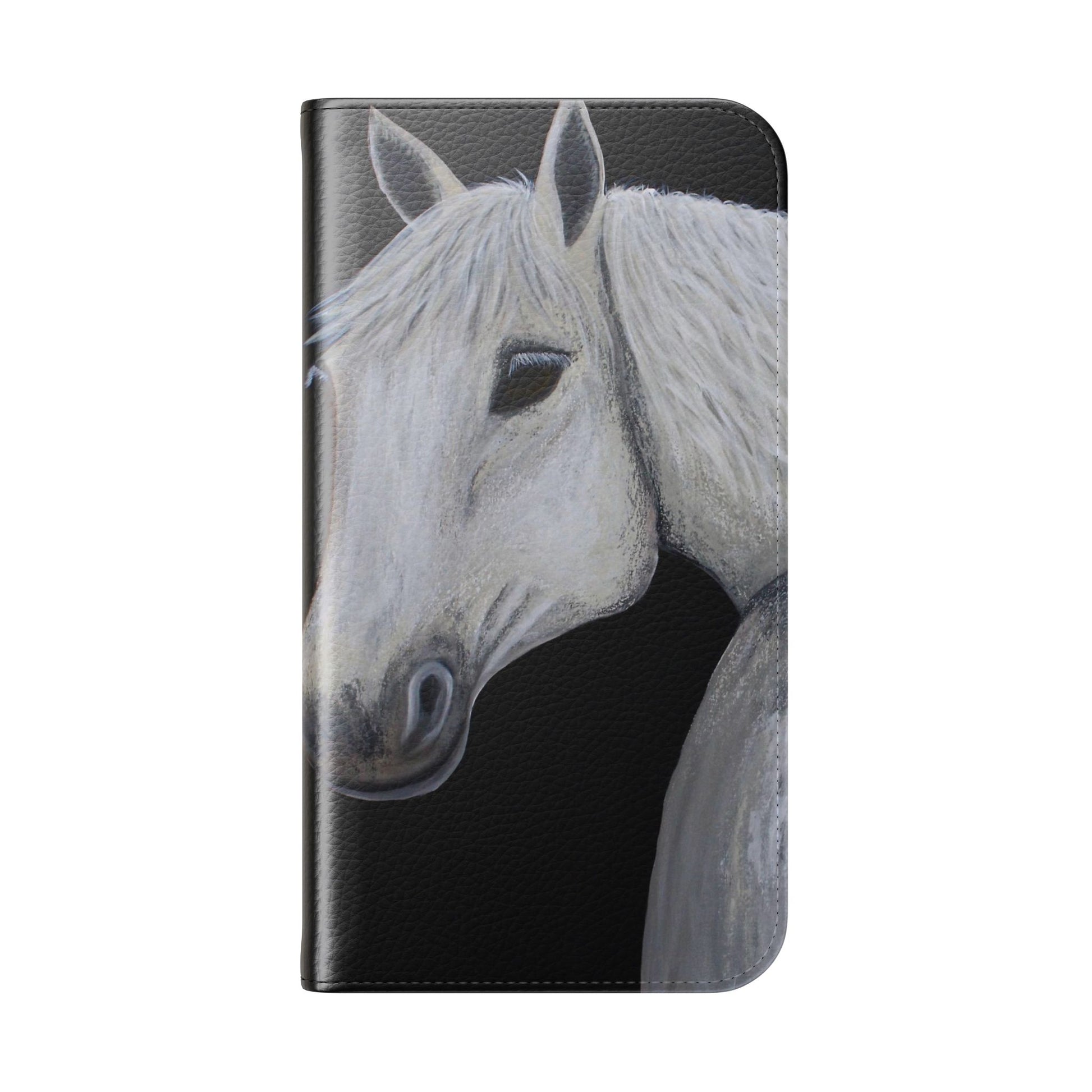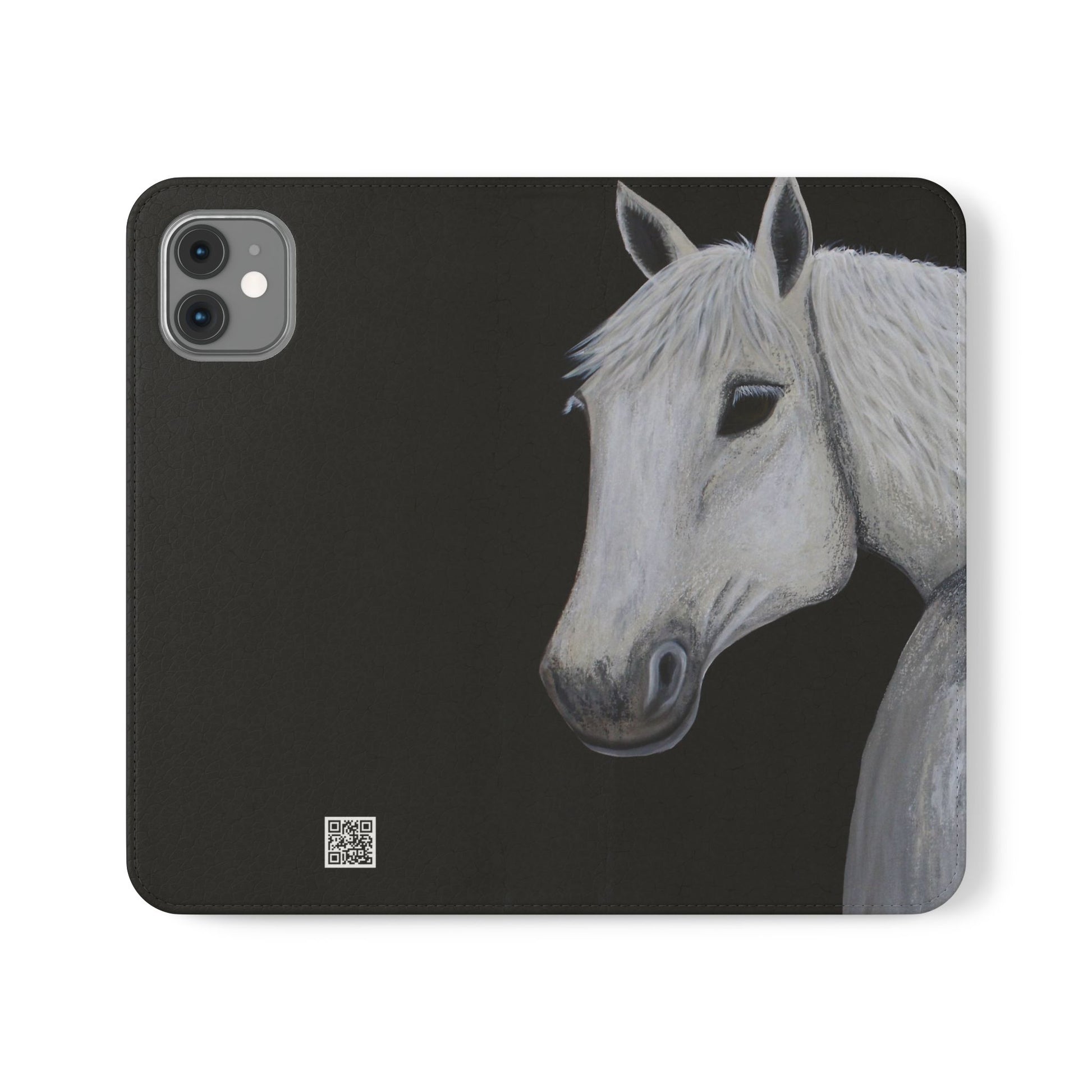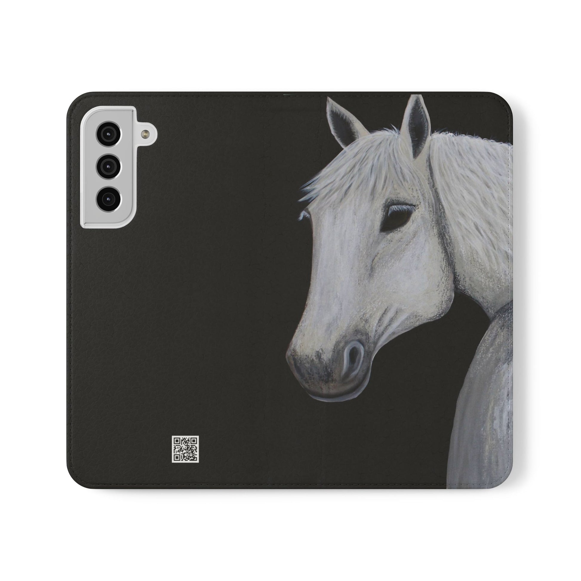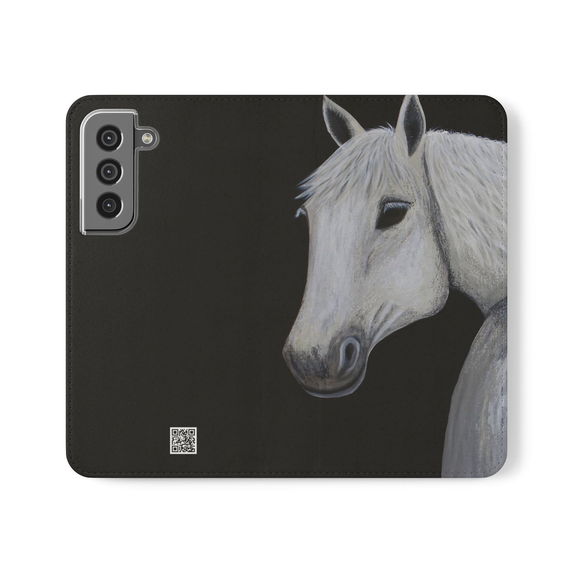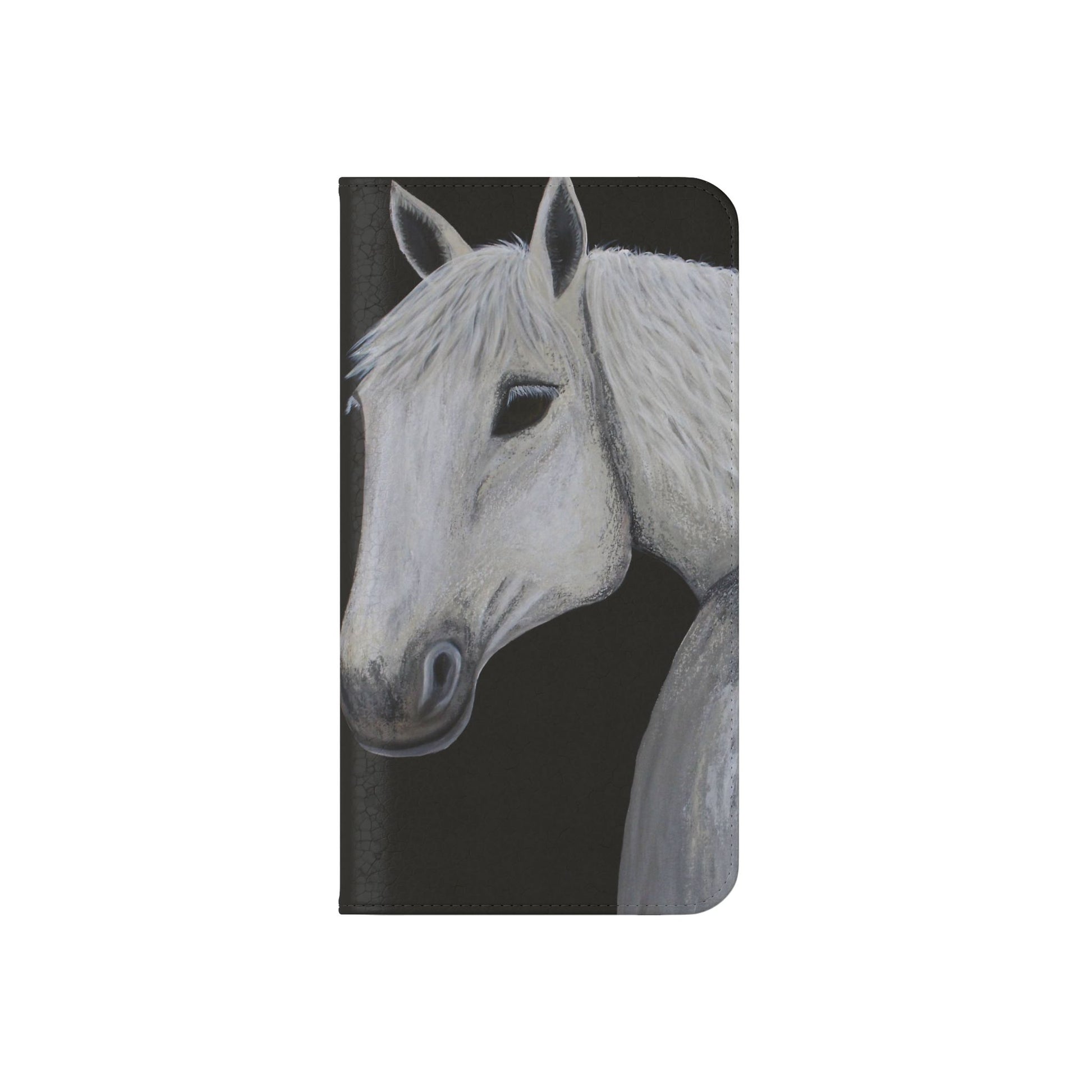 WOW my original hand painted Horse wallet flip phone cases are made from faux leather. Each case serves as a protective layer and a phone stand. "Ghost" the horse painted by Sarah Drury, aka Sagjol is beautifully printed on these stylish and practical phone cases. They feature a flat, elastic fastening to keep them closed and stitched inside pockets to store cards and cash storage easily. The polycarbonate inner shell keeps devices secure during regular wear and tear and also can serve as a protective layer from the phones radio waves...