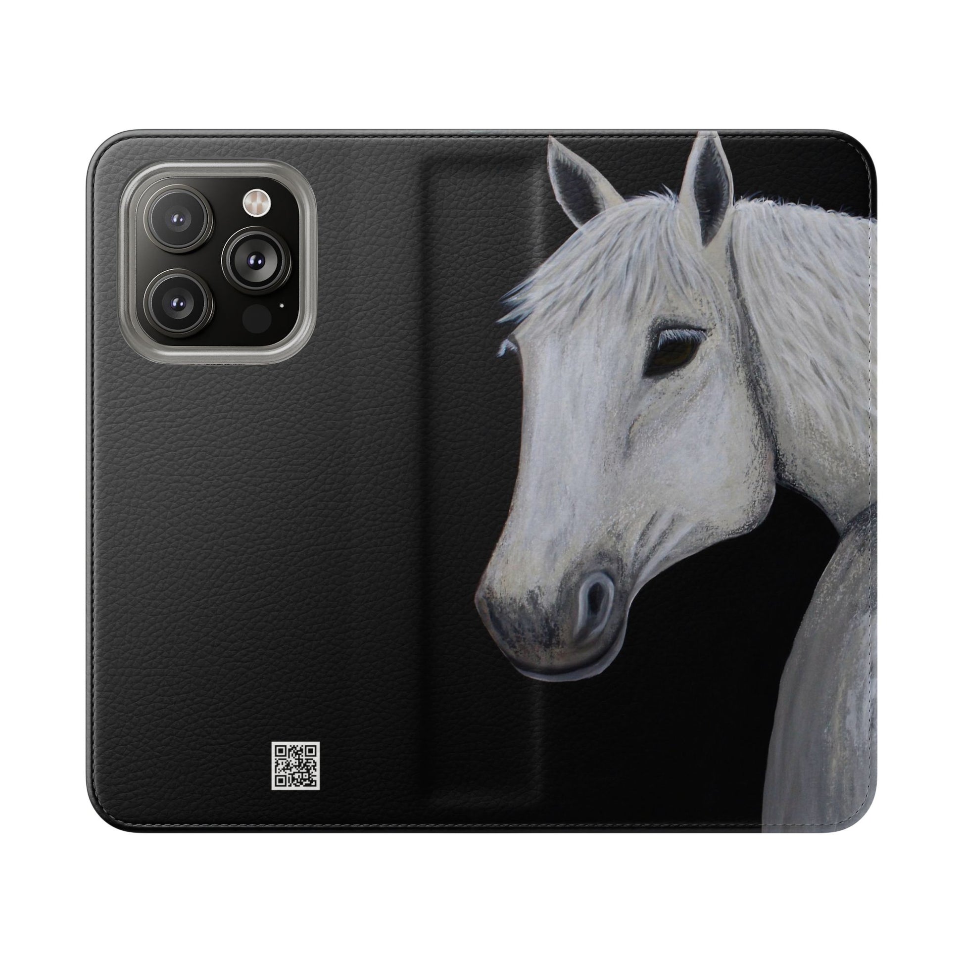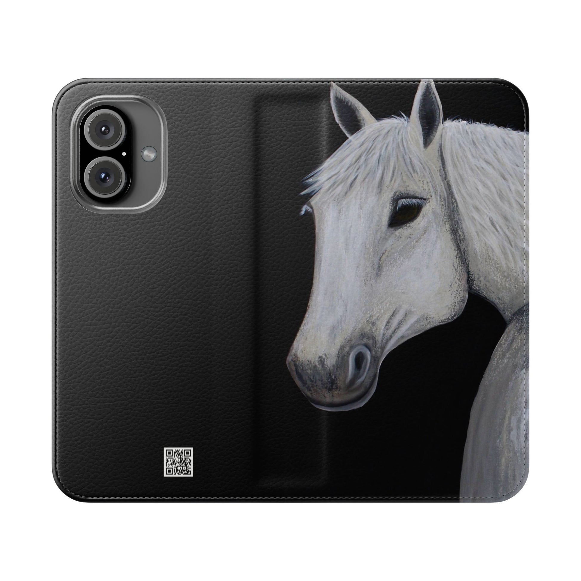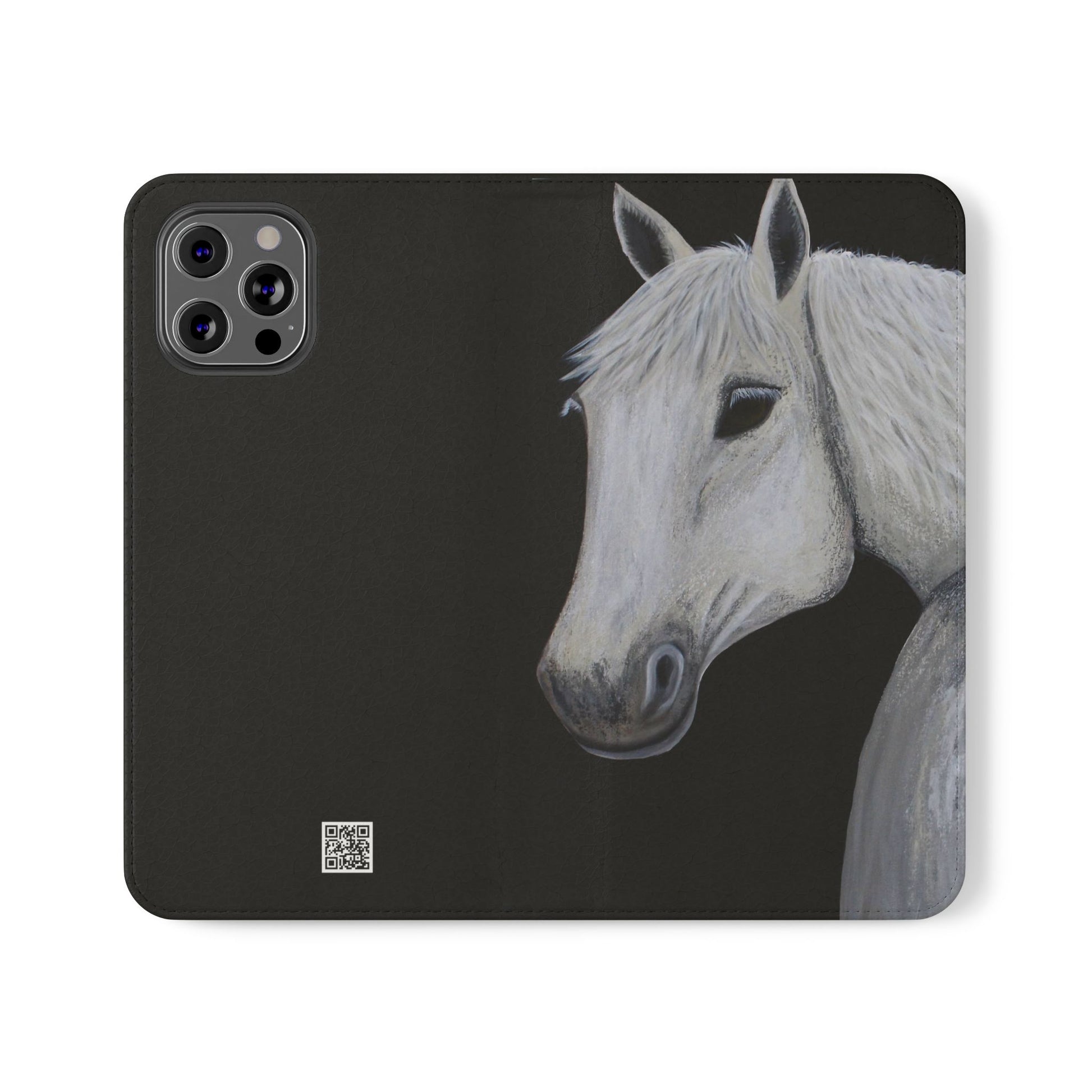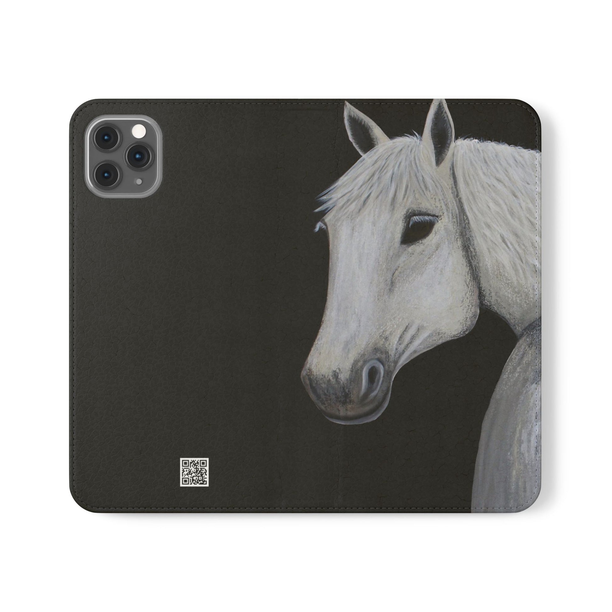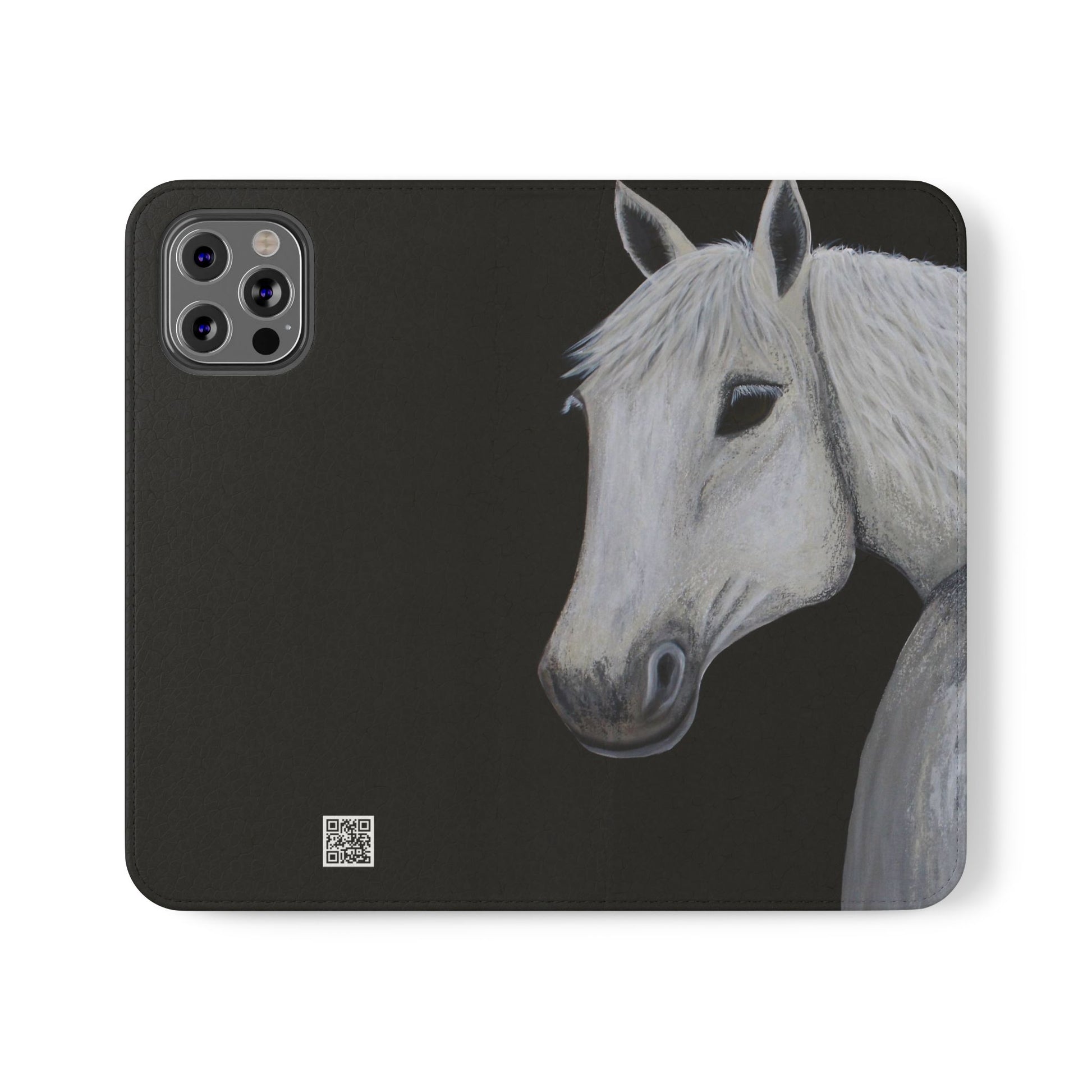 WOW my original hand painted Horse wallet flip phone cases are made from faux leather. Each case serves as a protective layer and a phone stand. "Ghost" the horse painted by Sarah Drury, aka Sagjol is beautifully printed on these stylish and practical phone cases. They feature a flat, elastic fastening to keep them closed and stitched inside pockets to store cards and cash storage easily. The polycarbonate inner shell keeps devices secure during regular wear and tear and also can serve as a protective layer from the phones radio waves...