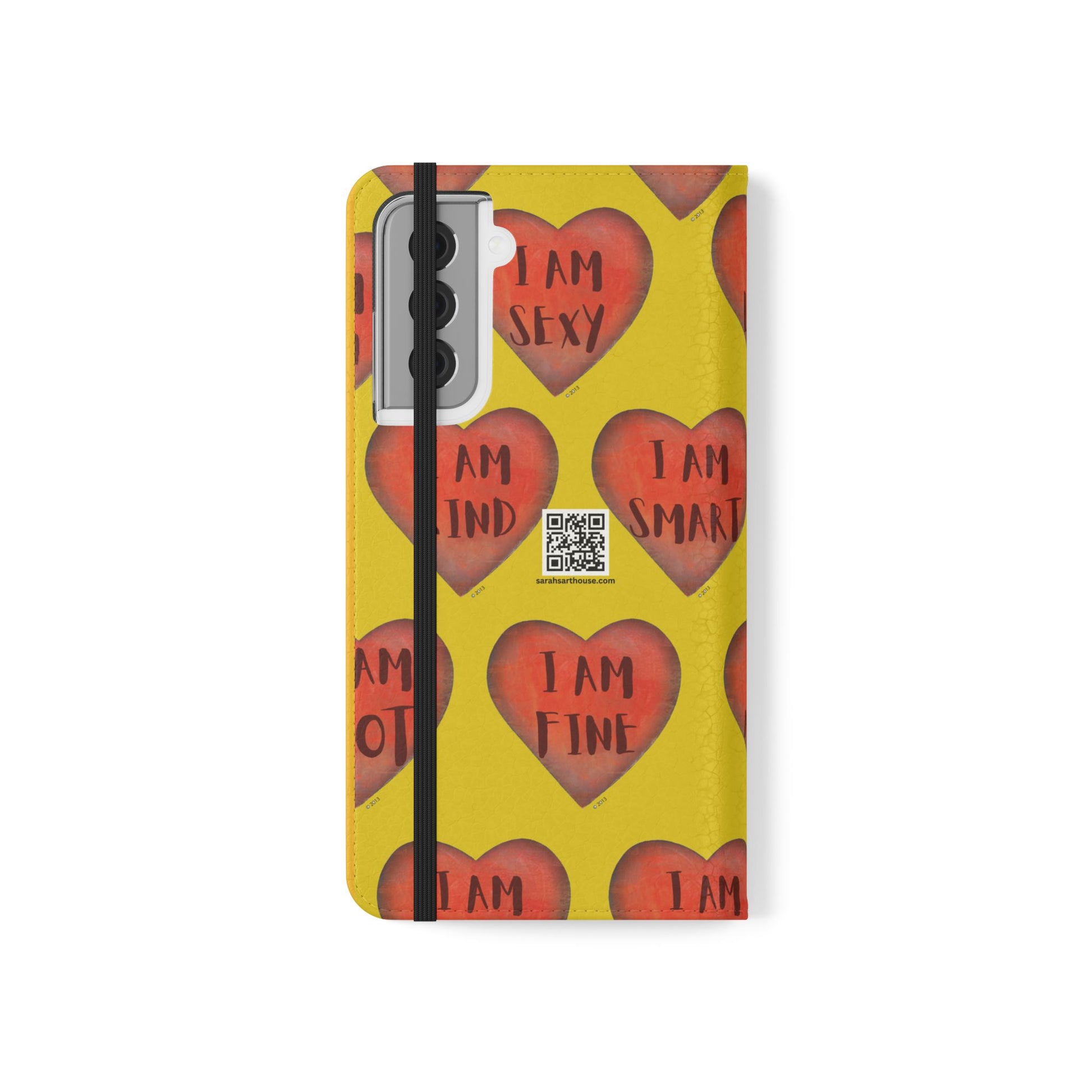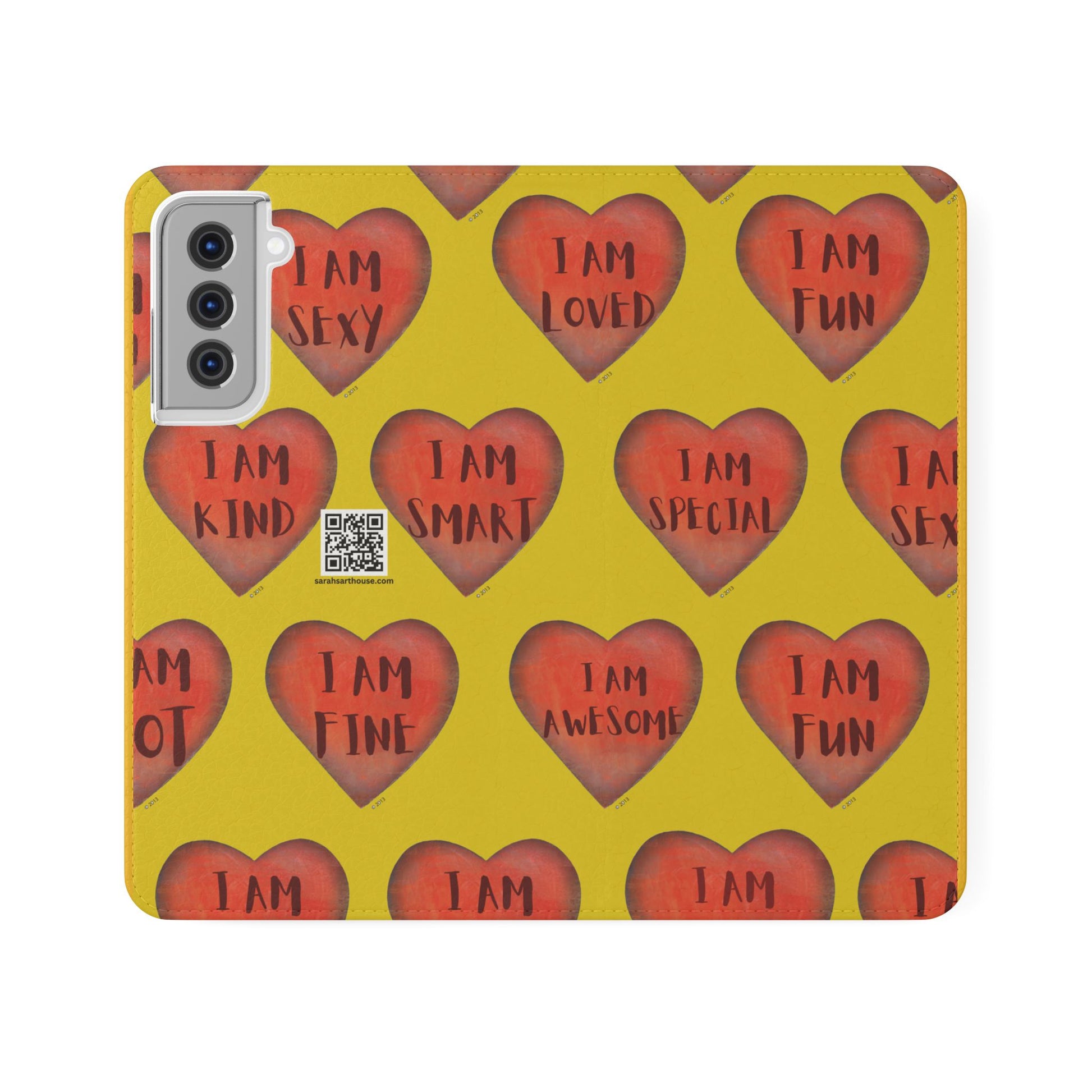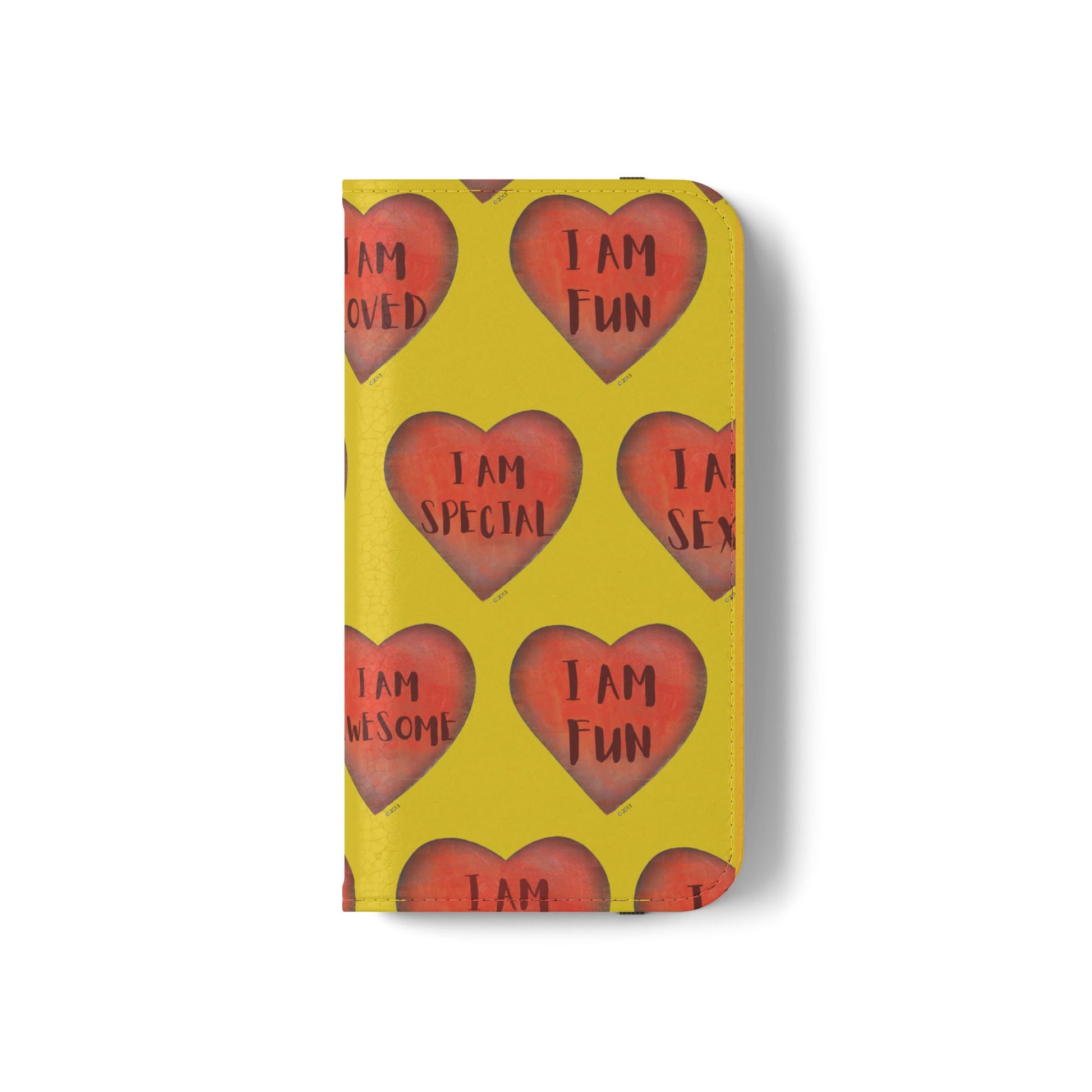 Motivational Heart, flip cases are made from faux leather. These are so fun, colorful and uplifting with their covers printed with "I am...." motivational phrases. They make the perfect Valentine, Birthday or Christmas Gifts. Each case serves as a protective layer and a phone stand. They feature a flat, elastic fastening to keep them closed and stitched inside pockets to store cards and cash storage easily. The polycarbonate inner shell keeps devices secure during regular wear and tear. They come in all sizes for iphones and Samsung....Just choose your size and enjoy.