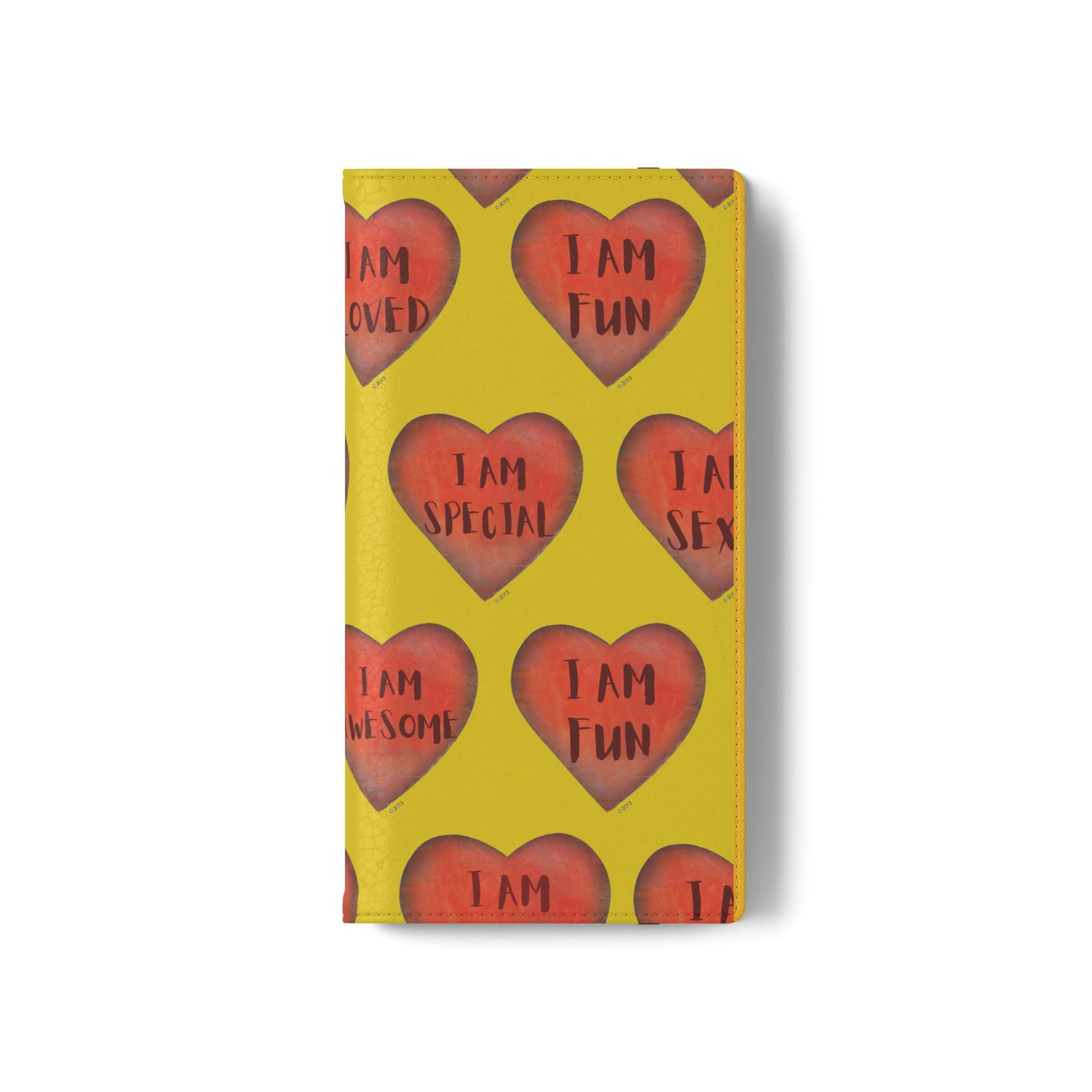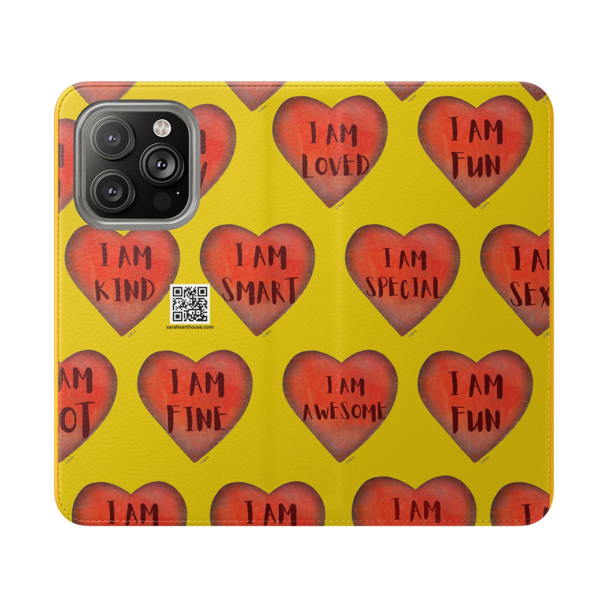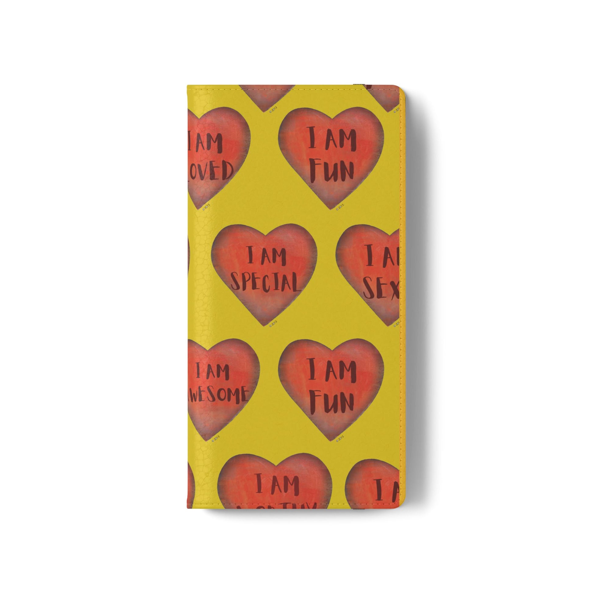 Motivational Heart, flip cases are made from faux leather. These are so fun, colorful and uplifting with their covers printed with "I am...." motivational phrases. They make the perfect Valentine, Birthday or Christmas Gifts. Each case serves as a protective layer and a phone stand. They feature a flat, elastic fastening to keep them closed and stitched inside pockets to store cards and cash storage easily. The polycarbonate inner shell keeps devices secure during regular wear and tear. They come in all sizes for iphones and Samsung....Just choose your size and enjoy.