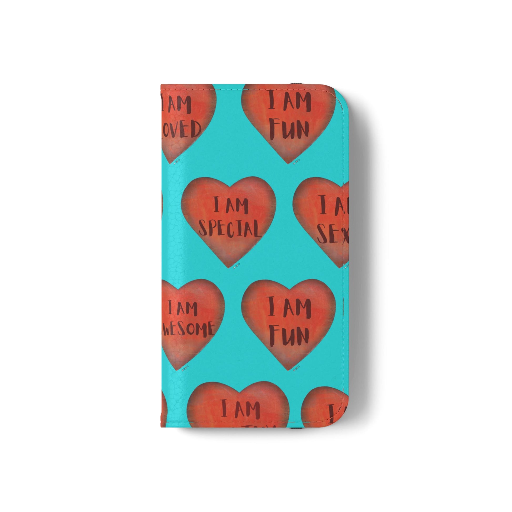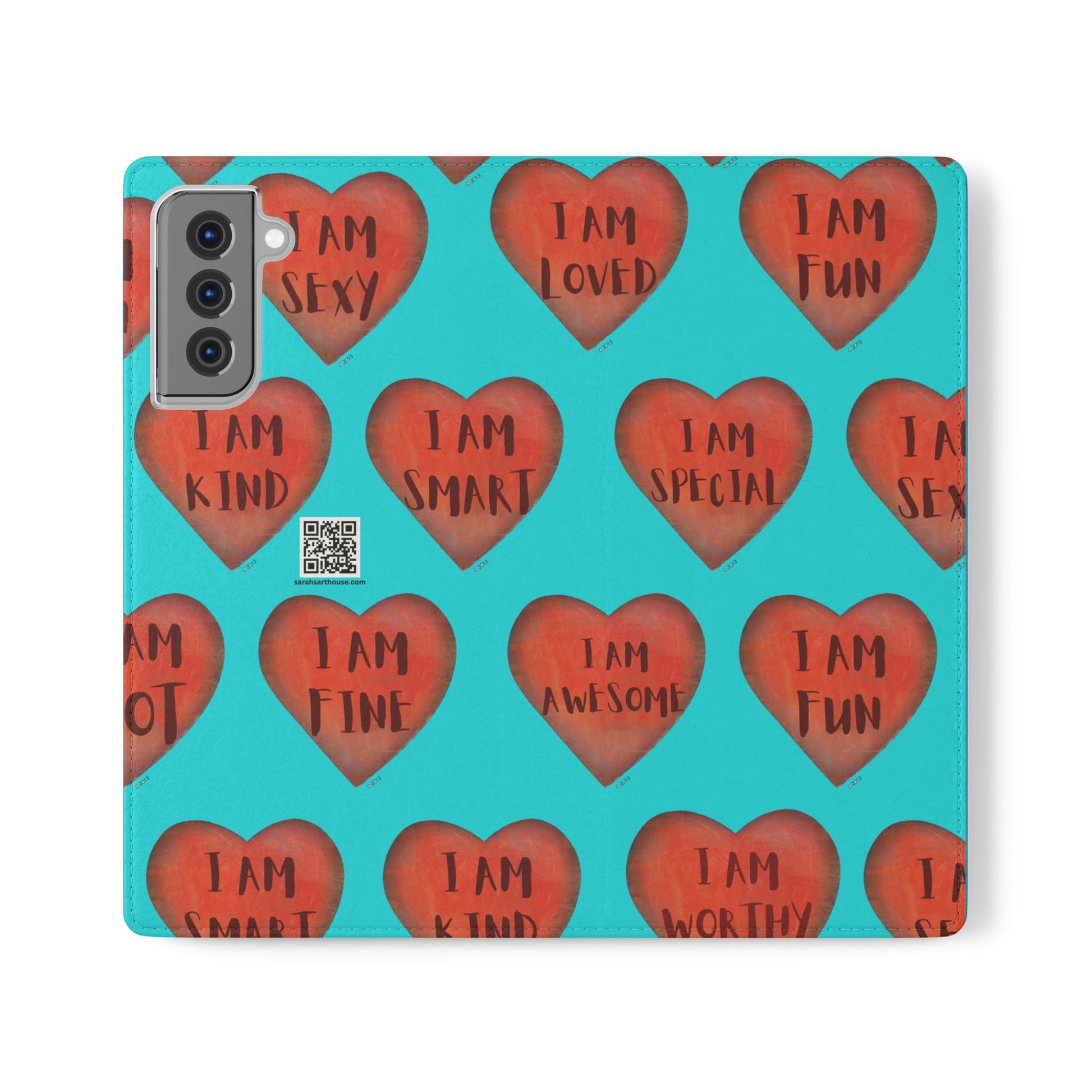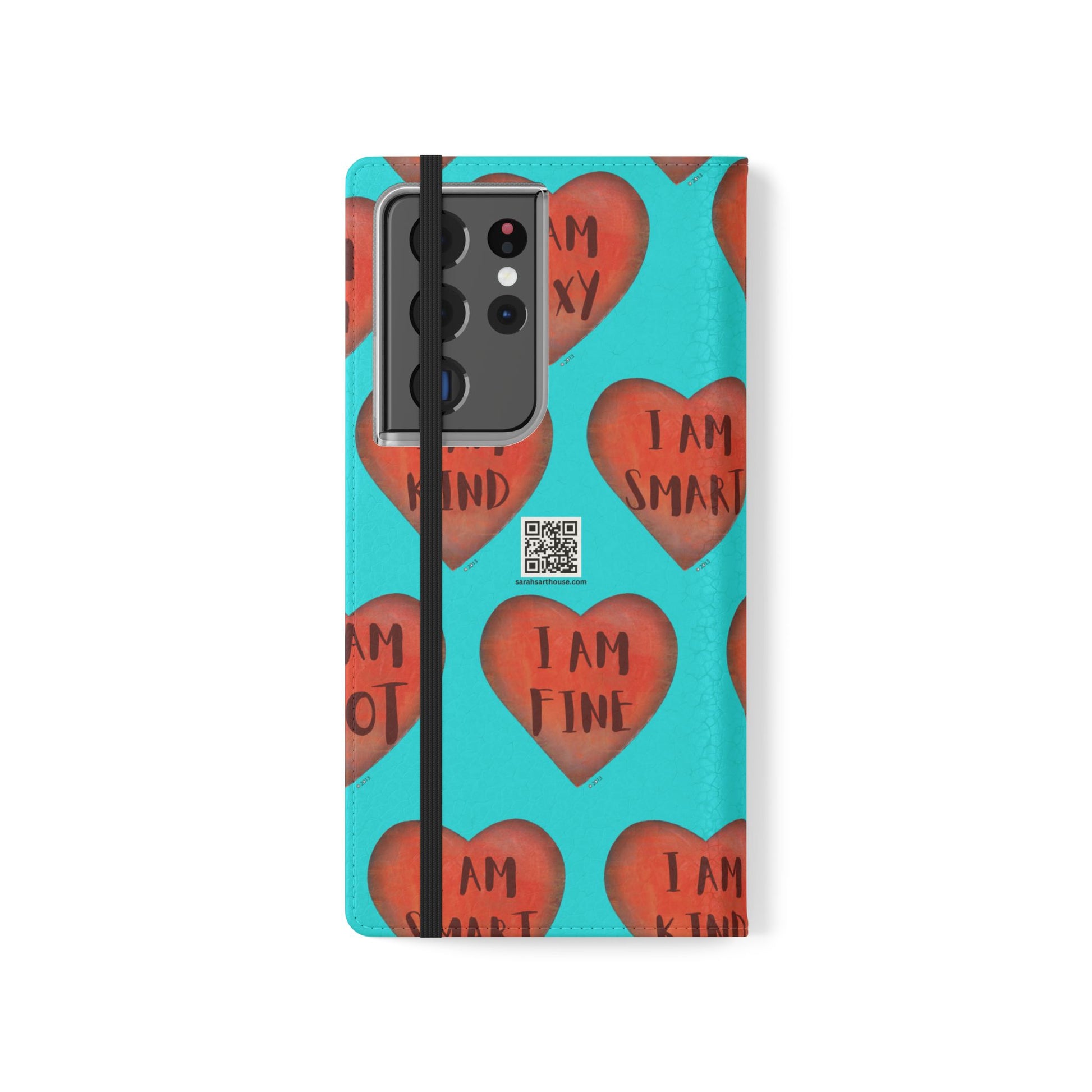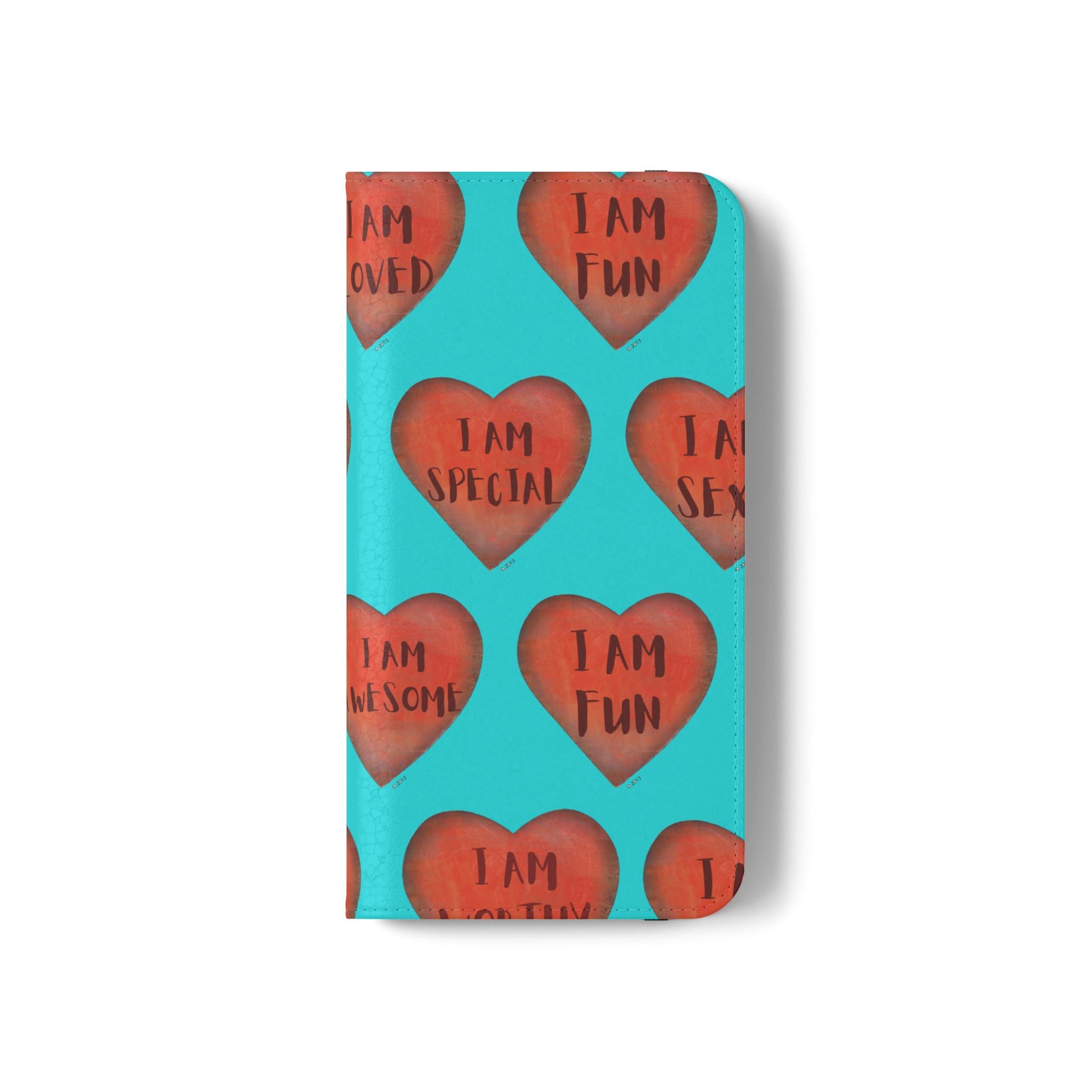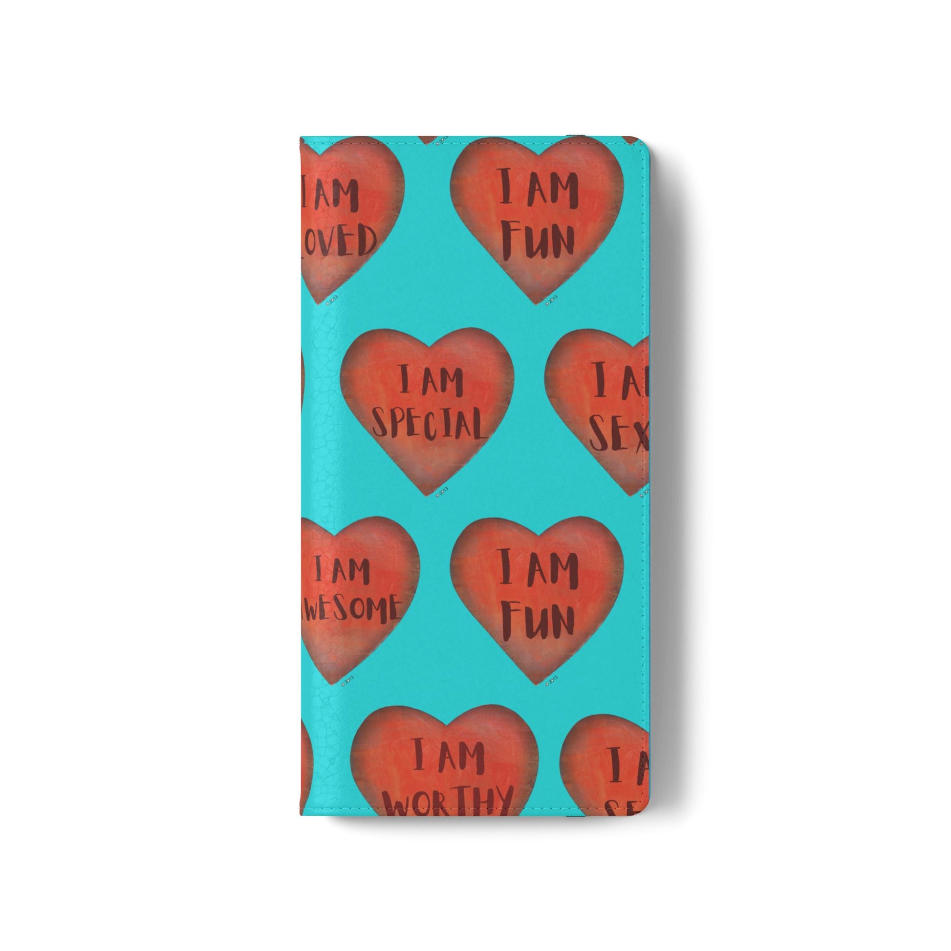 Motivational Heart, flip cases are made from faux leather. These are so fun, colorful and uplifting with their covers printed with "I am...." motivational phrases. They make the perfect Valentine, Birthday or Christmas Gifts. Each case serves as a protective layer and a phone stand. They feature a flat, elastic fastening to keep them closed and stitched inside pockets to store cards and cash storage easily. The polycarbonate inner shell keeps devices secure during regular wear and tear. They come in all sizes for iphones and Samsung....Just choose your size and enjoy.