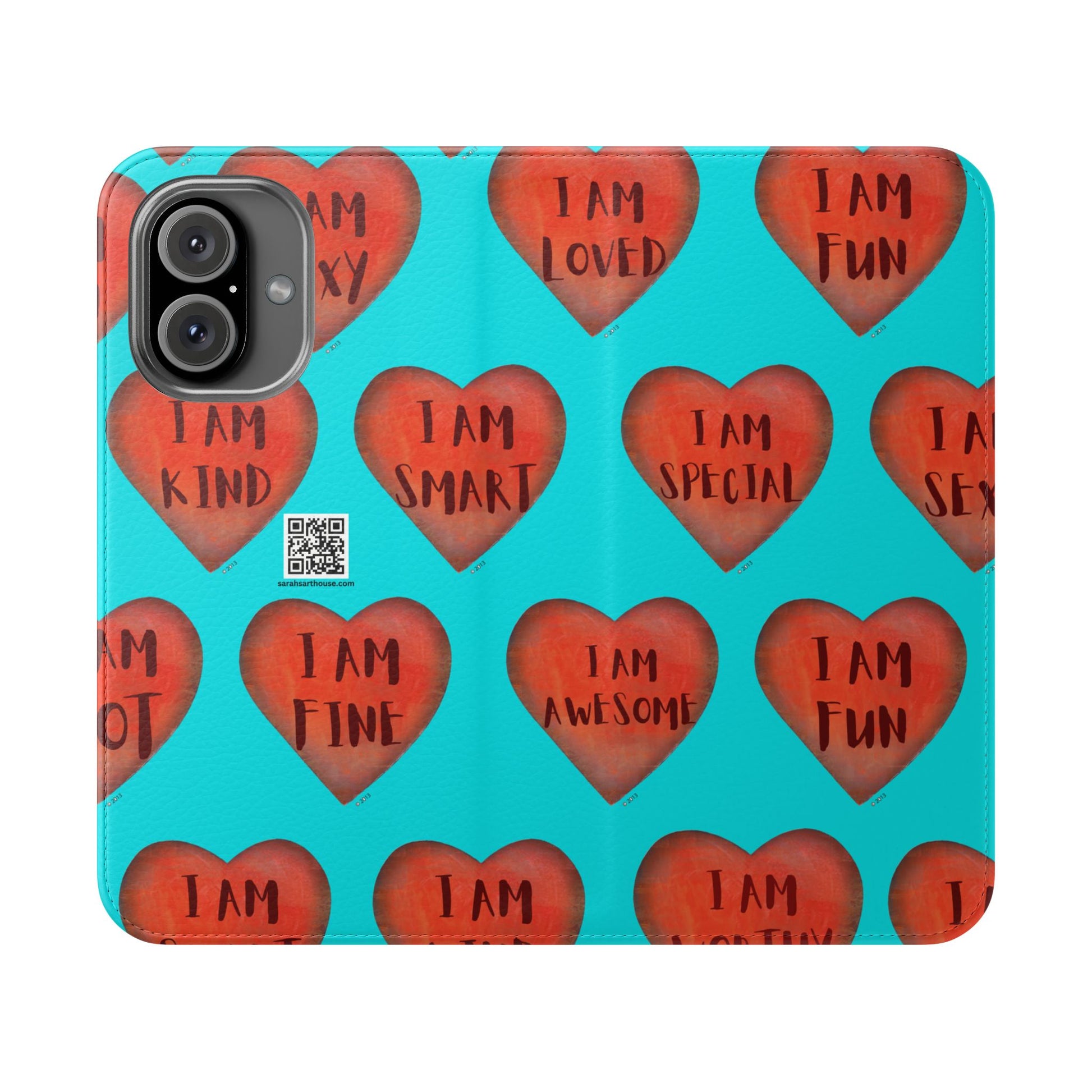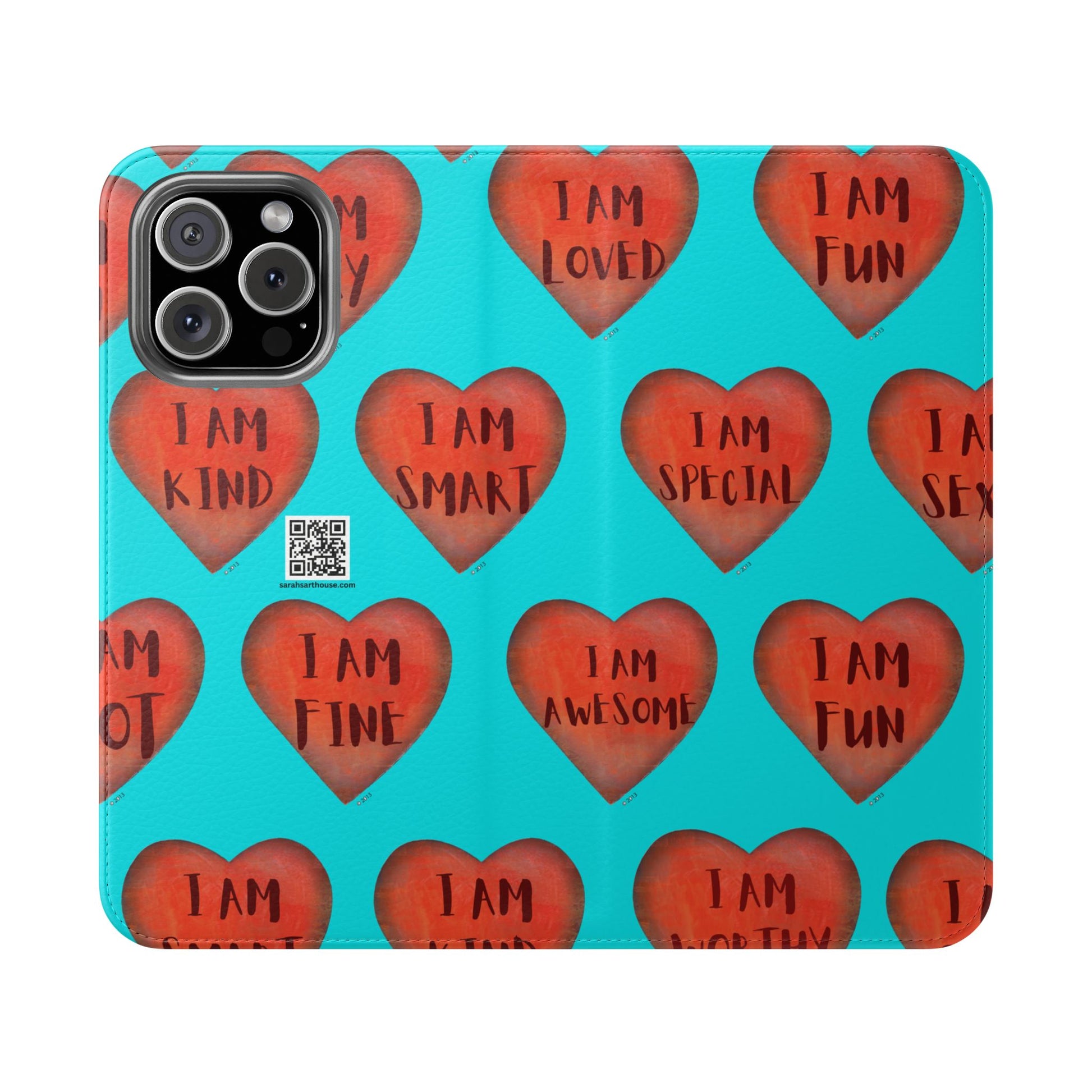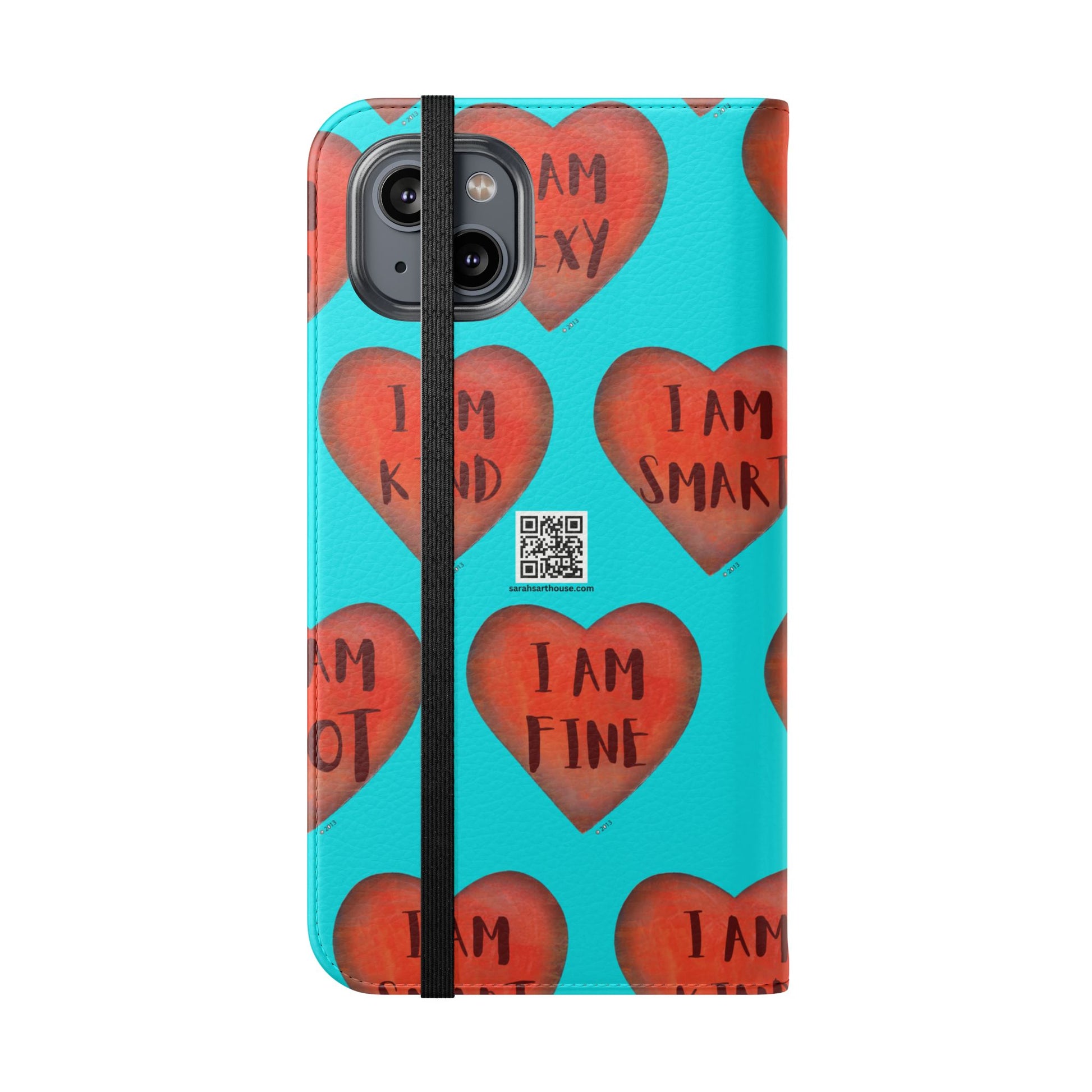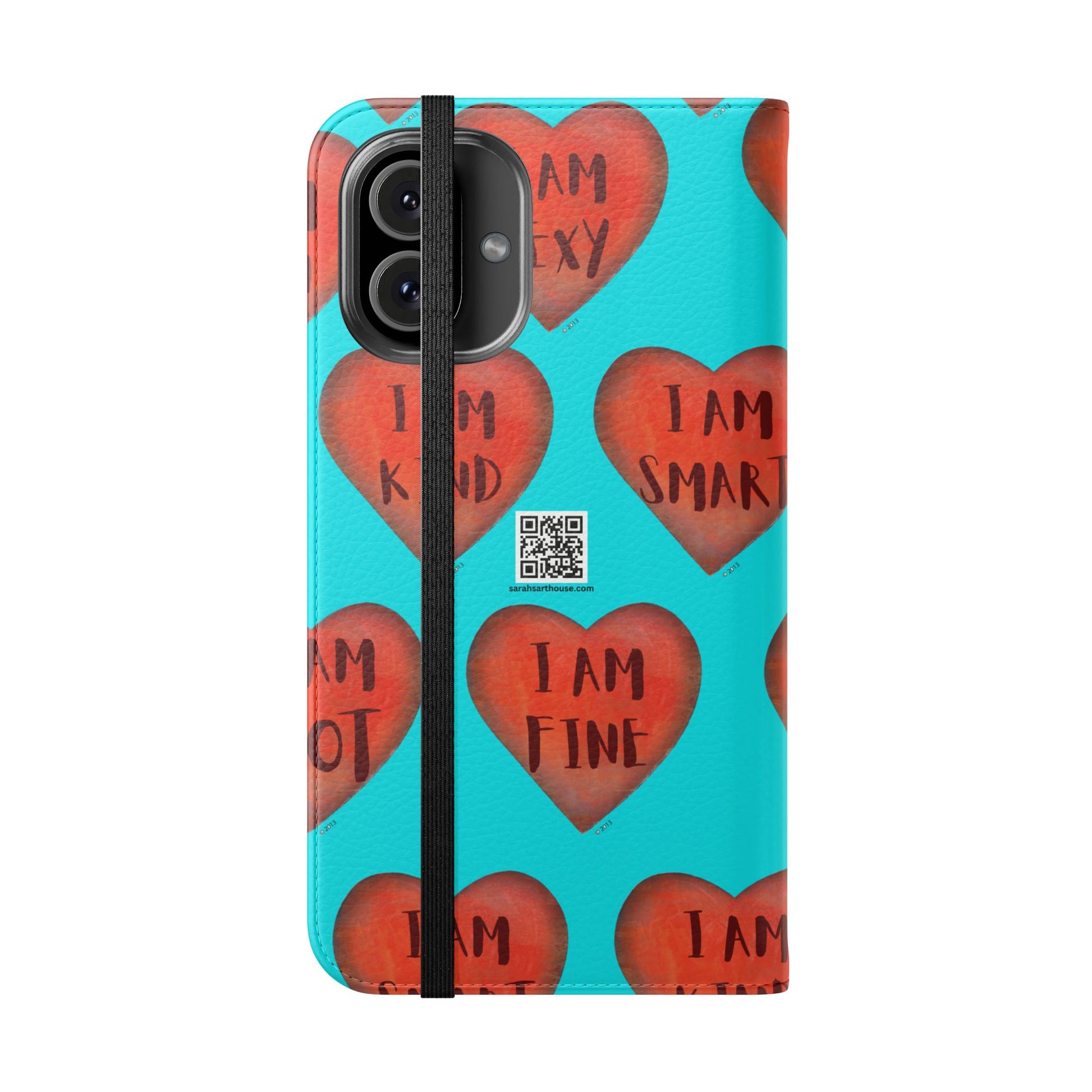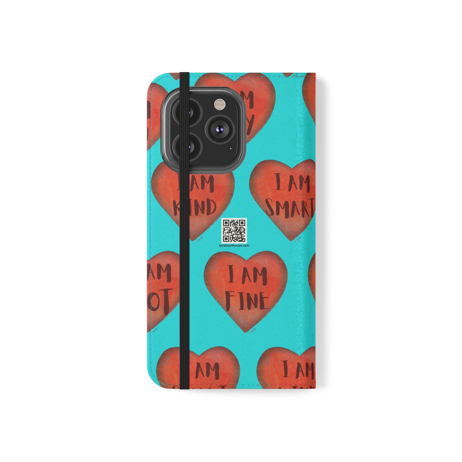 Motivational Heart, flip cases are made from faux leather. These are so fun, colorful and uplifting with their covers printed with "I am...." motivational phrases. They make the perfect Valentine, Birthday or Christmas Gifts. Each case serves as a protective layer and a phone stand. They feature a flat, elastic fastening to keep them closed and stitched inside pockets to store cards and cash storage easily. The polycarbonate inner shell keeps devices secure during regular wear and tear. They come in all sizes for iphones and Samsung....Just choose your size and enjoy.